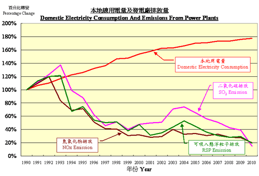 Electricity generation is a major source of air pollution in Hong Kong. A series of measures have been implemented to control emissions from power plants which include prohibiting the installation of new coal-fired generating unit since 1997, adopting best practicable means for emission control, encouraging the use of natural gas for electricity generation, imposing stringent emission caps on power plants through their specified process licences since 2005, and incentivising the two local power companies to promote the development of renewable energy for electricity generation through the Scheme of Control Agreement. In 2008, we also stipulated the stringent emission caps for 2010 and beyond through a Technical Memorandum (TM). In order to meet the stringent emission caps, the power companies had adopted additional emission reduction measures, including installing flue gas desulphurisation (FGD) systems and denitrification systems for coal-fired units, and increasing the use of low-emission coal and natural gas for electricity generation. In 2010, we reviewed the First TM and tightened the emission caps for the power sector from 2015 onwards, the compliance with which would require the power sector to maximise the use of existing gas-fired generation units and prioritise coal-fired generation units retrofitted with emission abatement facilities. Since then, we conducted eight more reviews on the TM and, after each review, issued a new TM to supersede the old one to further tighten the emission caps. The Ninth TM was issued in June 2021 and would tighten the emission caps of sulphur dioxide (SO2), nitrogen oxides (NOx) and PM10 by around 70% to 90% from 2026 onwards as compared with the emission caps set under the First TM.