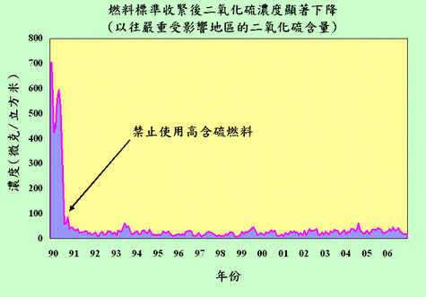 政府在1990年立例規限工業燃料的含硫量。自2008年,所有工商業工序必須使用超低硫柴油(即含硫量以重量計不超過 0.005% 的柴油) 。
