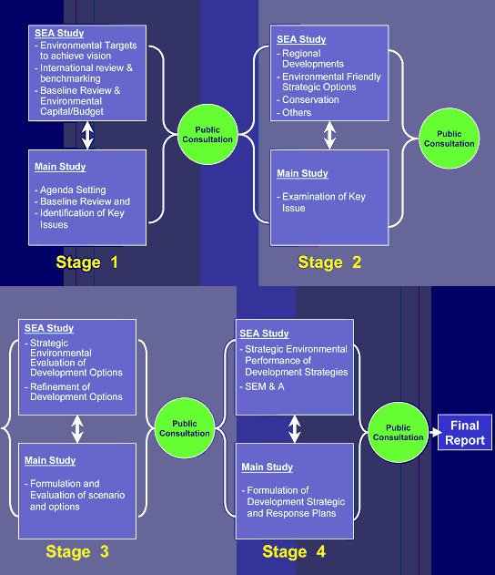 The SEA was divided into four stages coincided with the major study, providing environmental inputs at every critical time juncture.