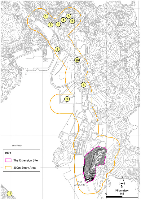 The Study Area for the noise impact assessment covered a distance of 300m from the roads with traffic generated by the Extension. Background noise measurements were conducted at the Study Area and the prevailing noise levels were 60 dB(A) Leq, 30min and 55 dB(A) Leq, 30min during day-time and night-time respectively.