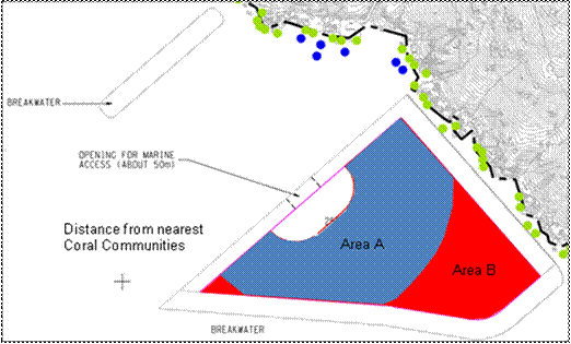 · Any gap that may need to be provided for marine access will be located at the middle of the North Western seawall, away from the identified coral communities and will be shielded by silt curtains systems to control sediment plume dispersion.