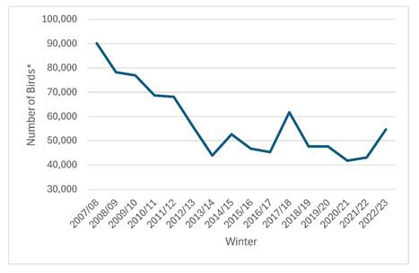 Peak waterbird number in Deep Bay, 2007/08 to 2022/23.