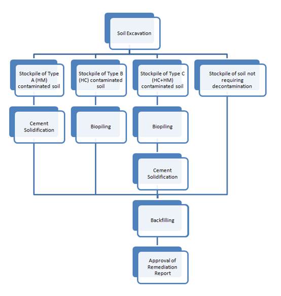 In terms of identified soil contamination, the proposed ground decontamination methods would remove contaminated soils from the grid concerned by excavation, followed by decontamination and testing to meet the requisite RBRGs by the relevant method(s) stated in Section 7.7 and then on-site backfilling. After completion of soil decontamination, no residual impact in respect of land contamination on future users of the Study Area is anticipated. After the completion of the remediation of the contaminated soil at the Project site, Remediation Reports (RR) shall be prepared and submitted to EPD for approval. No construction works for permanent development of site should be carried out prior to the approval of RR for the associated area.