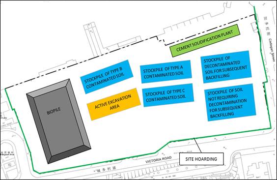 ˇ Avoid temporary stockpiling as far as practical. In case temporary storage is needed, contaminated soil should be placed in designated area paved with either concrete or lined with impermeable sheeting, bunded and covered properly with tarpaulins to prevent cross-contamination of different types of contaminated soil;