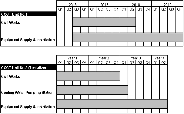 Assuming that the construction of CCGT Unit No.1 can commence from the second half of 2016, site clearance work will commence immediately while the civil work will start Q3 of 2016 till the Q2 of 2018, lasting for about 24 months. Plant and equipment will be delivered to the site and the installation work is expected to commence in parallel. The equipment installation work will last for about another 18 months followed by commissioning and reliability test. Commercial operation of CCGT Unit No.1 is anticipated by the end of 2019.