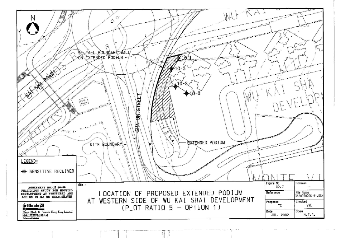 | Table C2.7 : Predicted Unmitigated and Mitigated Traffic Noise Levels at representative NSR at Western Side of Wu Kai Sha Station Development (Extended Podium as Mitigation for Plot Ratio 5 Option 2) |