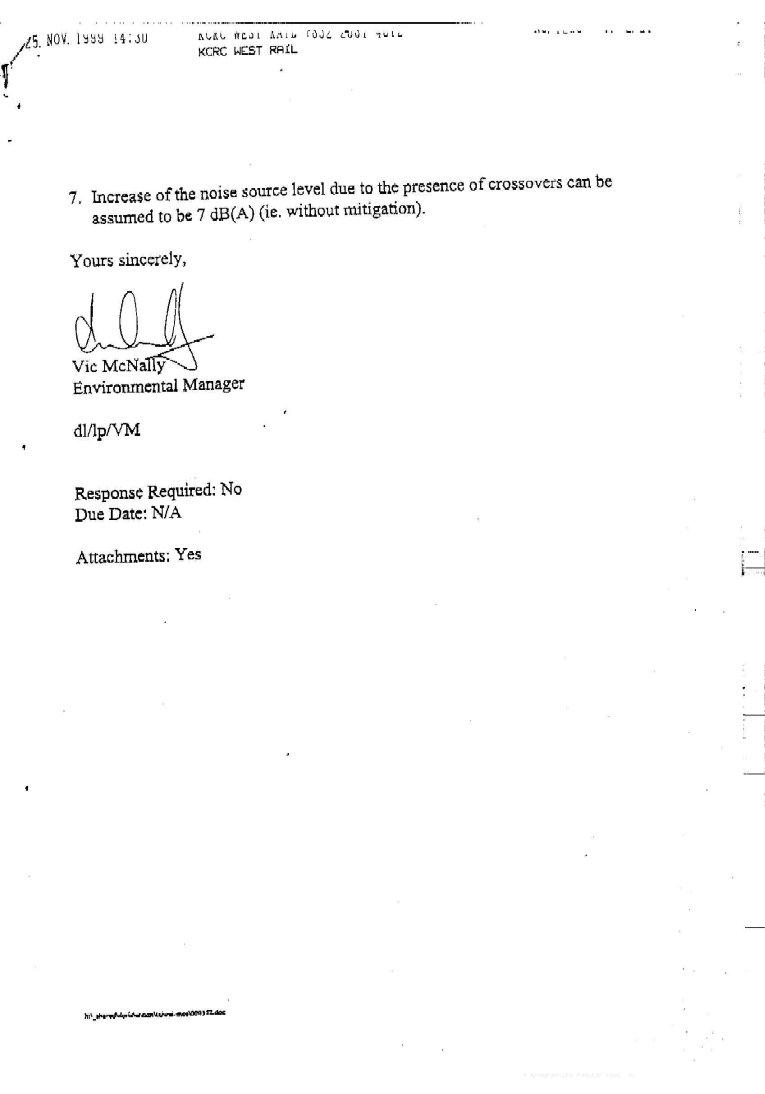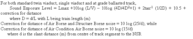 are as follows: Obtain the reference Lmax of a train at 25m from a continuously welded rail at speed Vo. According to the KCRC information (Annex C3, Ref ERE/IF/EN102/tw-mos/000352, dated 23 Nov., 1999) the airborne Lmax of the MOS Rail train is assumed to be 81.2 dB(A) at 80kph measured at 25m away from the ballast track. The structure borne noise of MOS Rail train Lmax using Floating Slab Track at 25m at 80 kph is 56 dB(A). The air-conditioning (AC) noise of MOS train Lmax at 15m is 57 dB(A). Determine the locations of the NSRs Divide the railway alignment into different segments in accordance with the different speeds, orientation of railway Determination of Lmax Correction of track wear is 3.0 dB(A) Correction for viaduct slab track reflection is 2.0 dB(A) Increase of rolling stock levels due to points and crossings = 7 dB(A) Determination of SEL Determination of Leq