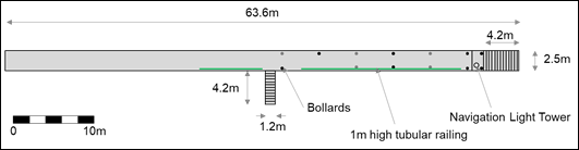of the pier and a row of bollards is on each side of the pier. Two sets of 1m