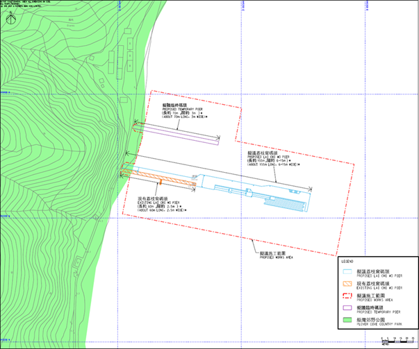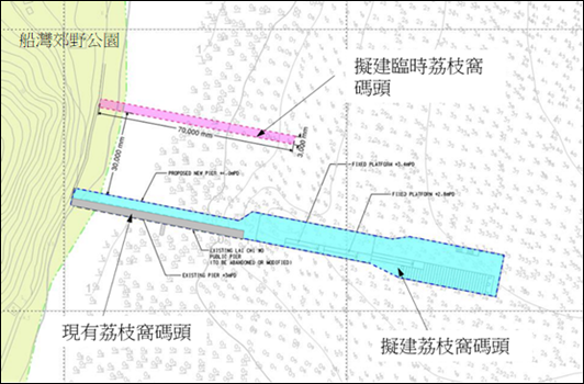 (c) 為於整個施工期間保持來往荔枝窩的連繫,將利用工作躉船及/或由樁柱支撐的鋼筋結構,提供臨時靠泊及繫泊設施(臨時碼頭);