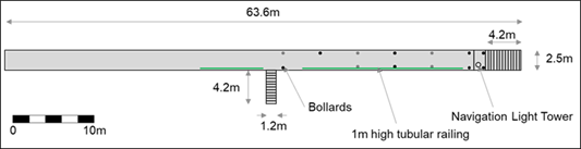 2.1.2.1 現有荔枝窩碼頭是實體混凝土指形突碼頭,長約64米,闊約2.5米。碼頭位於主水平基準以上約3米,碼頭墩頭位置的海床深度約為主水平基準以下約1米。在碼頭盡處的墩頭位置設有一條長4.2米的登岸梯級,而在碼頭約25-30米處,設有一條長4.2米、闊1.2米的梯級。另外,在碼頭盡處有一支導航燈,碼頭兩側設有各一排繫纜柱,碼頭的西南邊緣亦有兩組1米高的鍍鋅鋼管欄杆。荔枝窩碼頭的示意圖載於圖2.1。