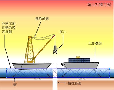 海上打樁工程使用樁柱套管及淤泥屏障示意圖 |