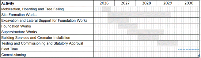 2.10.1. Construction of the Project is planned to commence in 2026 and end in 2030. Commission of the proposed WHS Crematorium is in 2030 tentatively. The tentative construction programme for the Project is provided in Table 2.5.