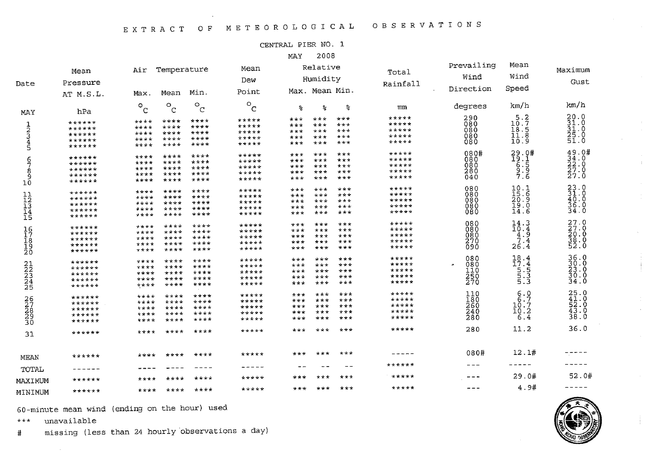 | Extract of Meteorological Observations for Victoria Peak Automatic Weather Station, May 2008 | ||||||||||||||||||
