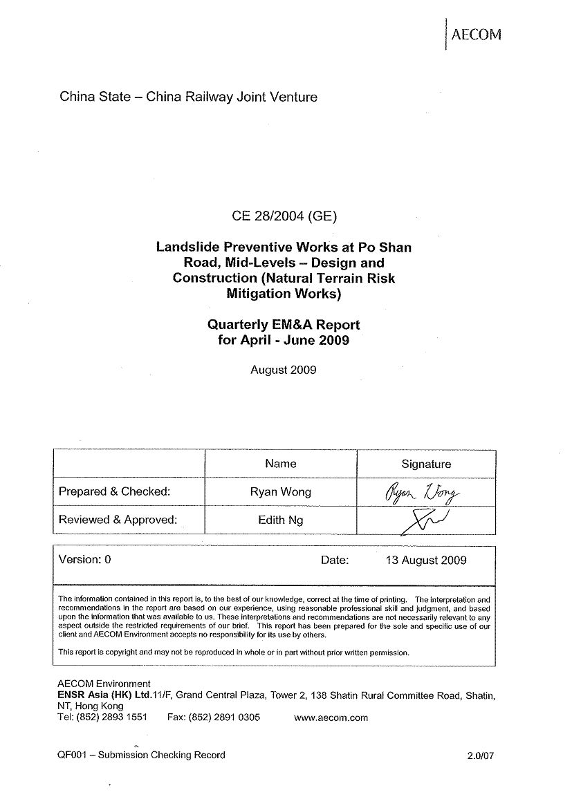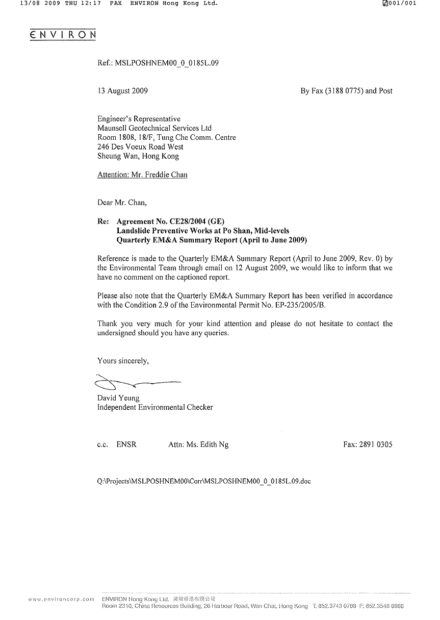 7.4 Air quality and noise monitoring, ecological monitoring, bi-weekly landscape and visual audit and weekly site inspection were carried out from April 2009 to June 2009, in accordance with the EM&A Manual.