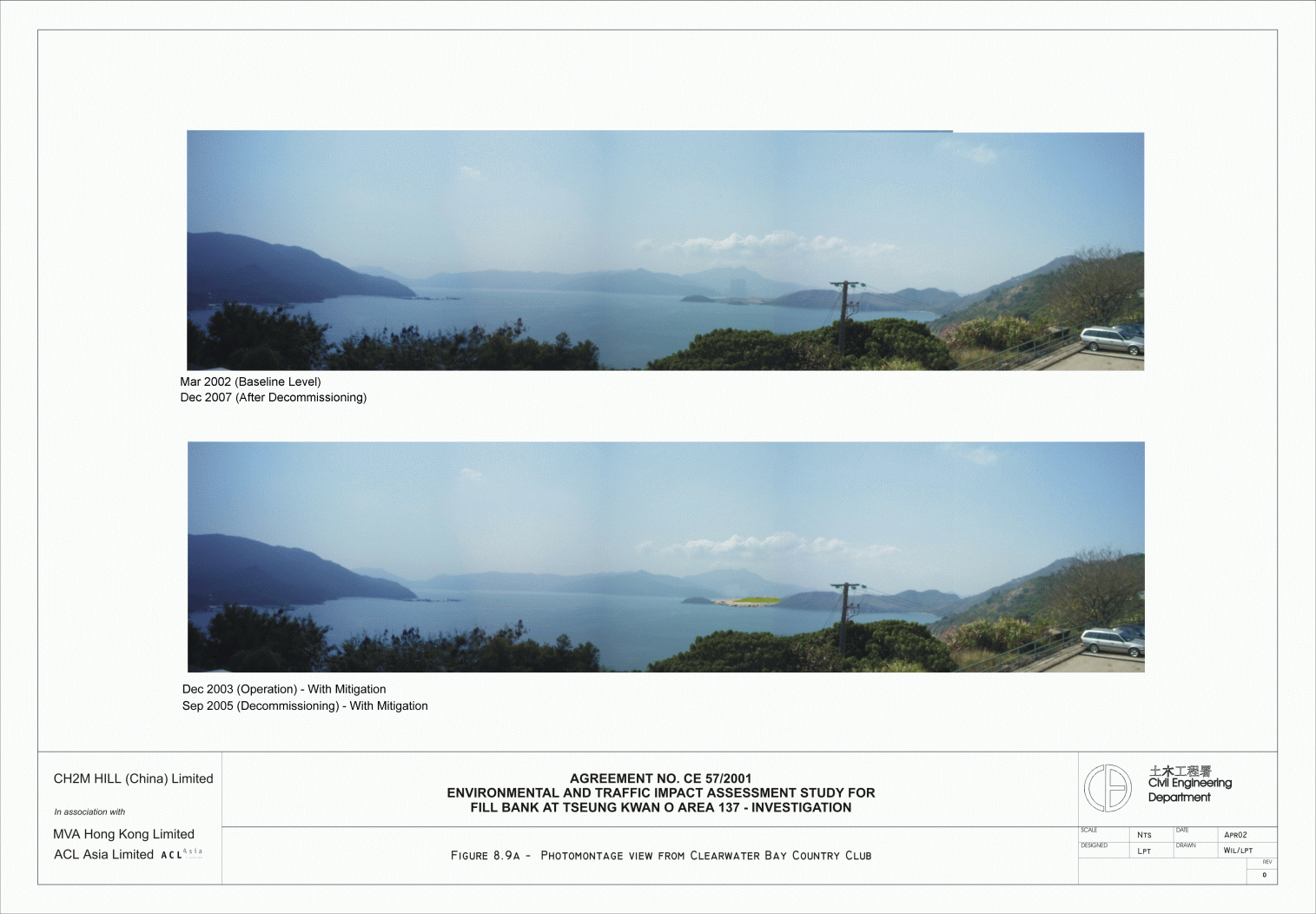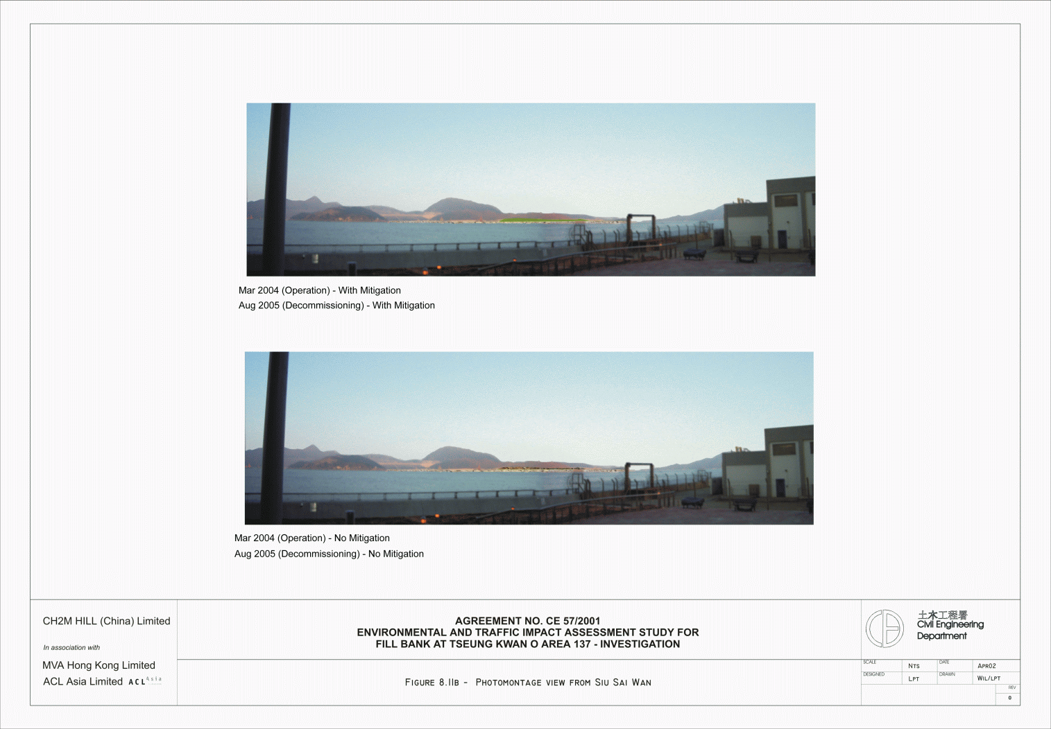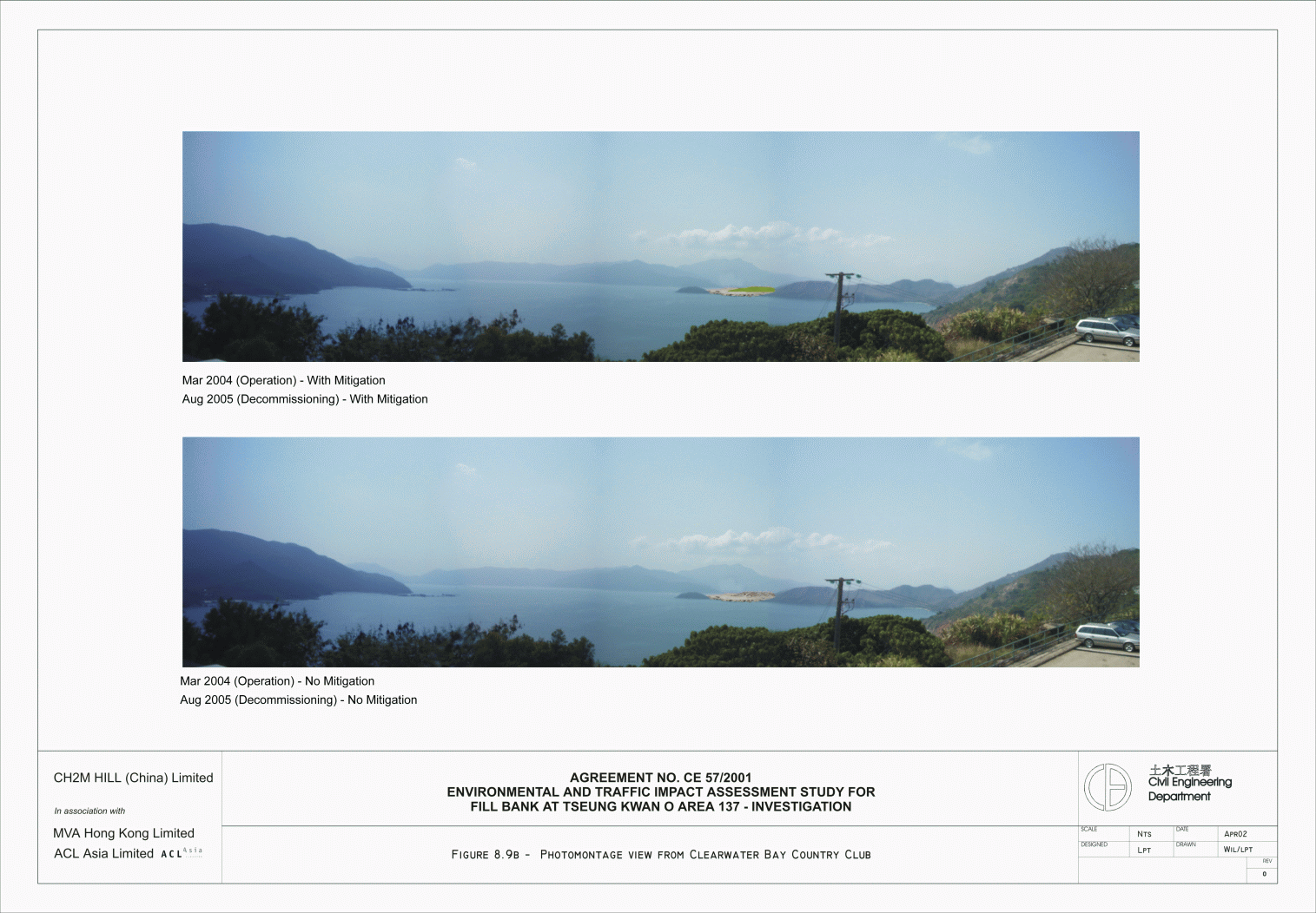 8.13.6 The residual visual impacts of the proposal will be reduced to 'Slight Impact' during the operational stage and 'Slight to Negligible Impact' during the decommissioning phase. Photomontage (Figure 8-9) for Clear Water Bay Country Park shows that if the design of the Fill bank is shaped such that it does not block the view between the Country Park and Tit Cham Chau and is covered in an appropriate material, the visual impact will be significantly mitigated.