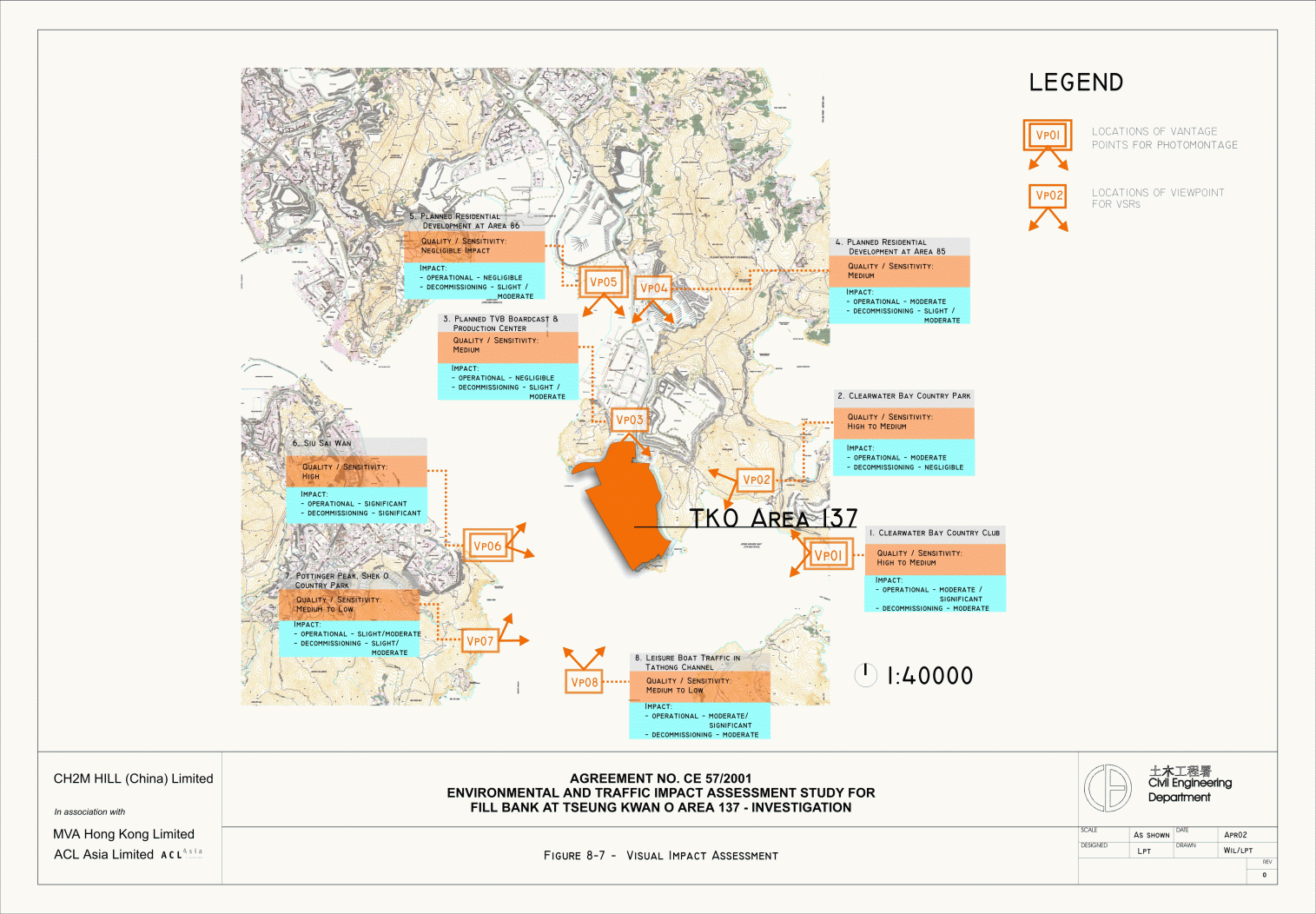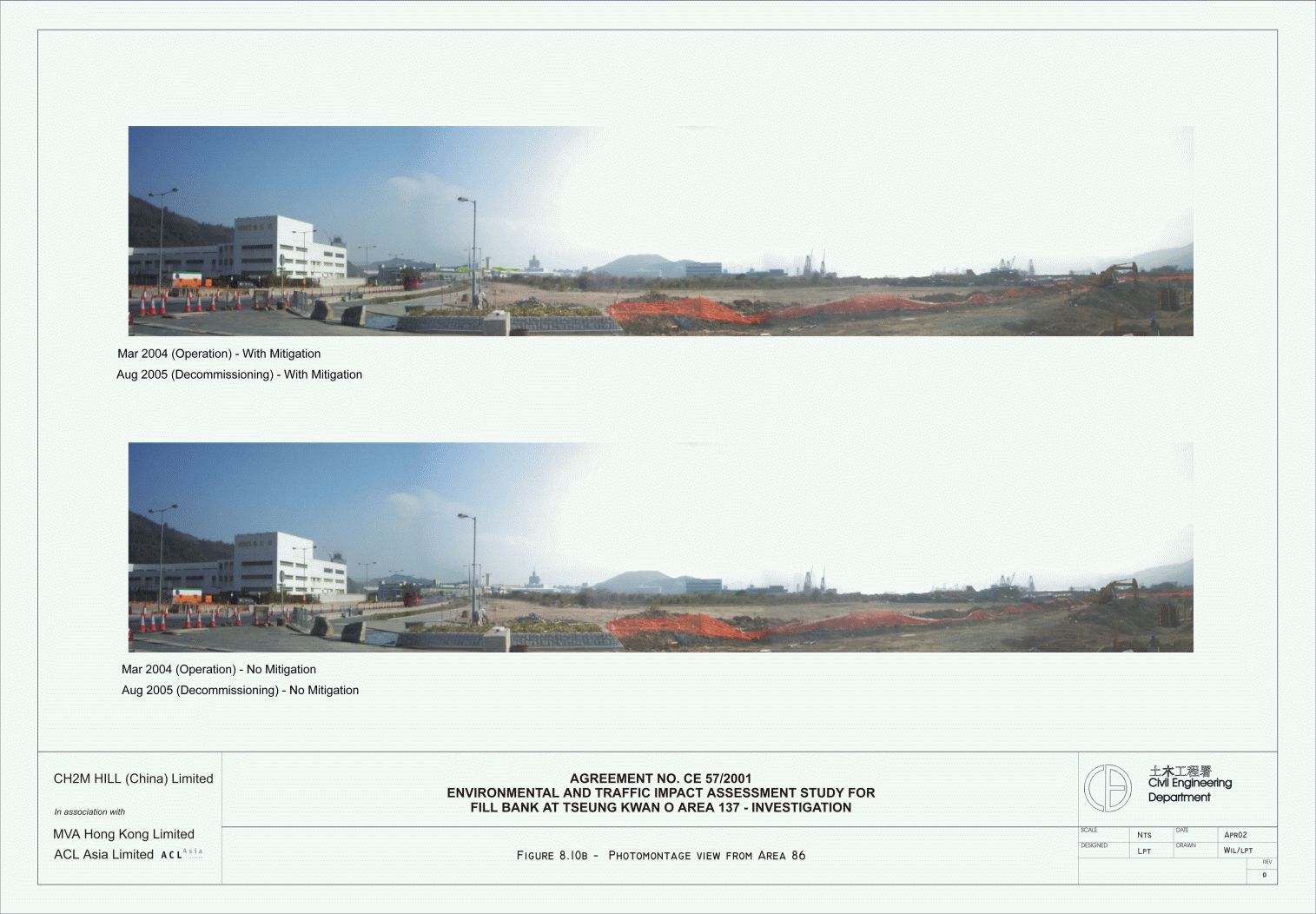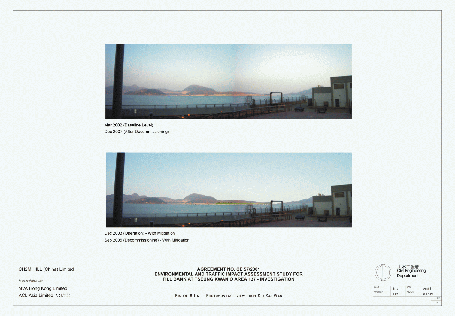 8.13.6 The residual visual impacts of the proposal will be reduced to 'Slight Impact' during the operational stage and 'Slight to Negligible Impact' during the decommissioning phase. Photomontage (Figure 8-9) for Clear Water Bay Country Park shows that if the design of the Fill bank is shaped such that it does not block the view between the Country Park and Tit Cham Chau and is covered in an appropriate material, the visual impact will be significantly mitigated.