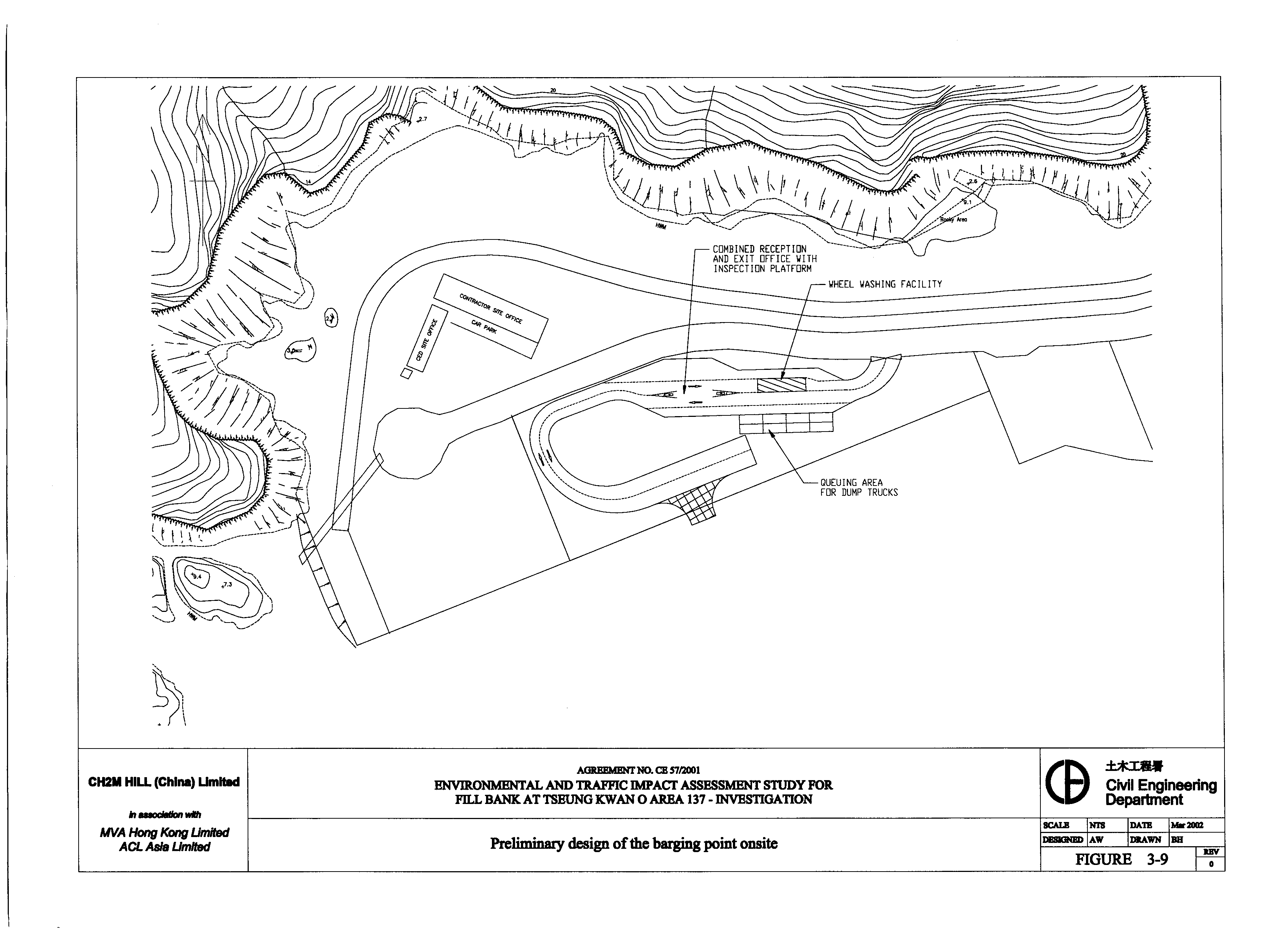 9.2.6 As a proactive approach to minimise potential traffic noise and vehicular emission impact associated with the public fill delivery trucks using the fill bank during the operational phase, a public filling barging facility will be established at TKO Area 137 and at the runway of the ex-Kai Tak airport to allow the use of barges to transport public fill to the site. This measure will allow the Kai Tak barging point to share a truckload of 1,000 vehicles/day on Wan Po Road to minimise the traffic noise and vehicular emission impact associated with the trucks travelling to the fill bank.