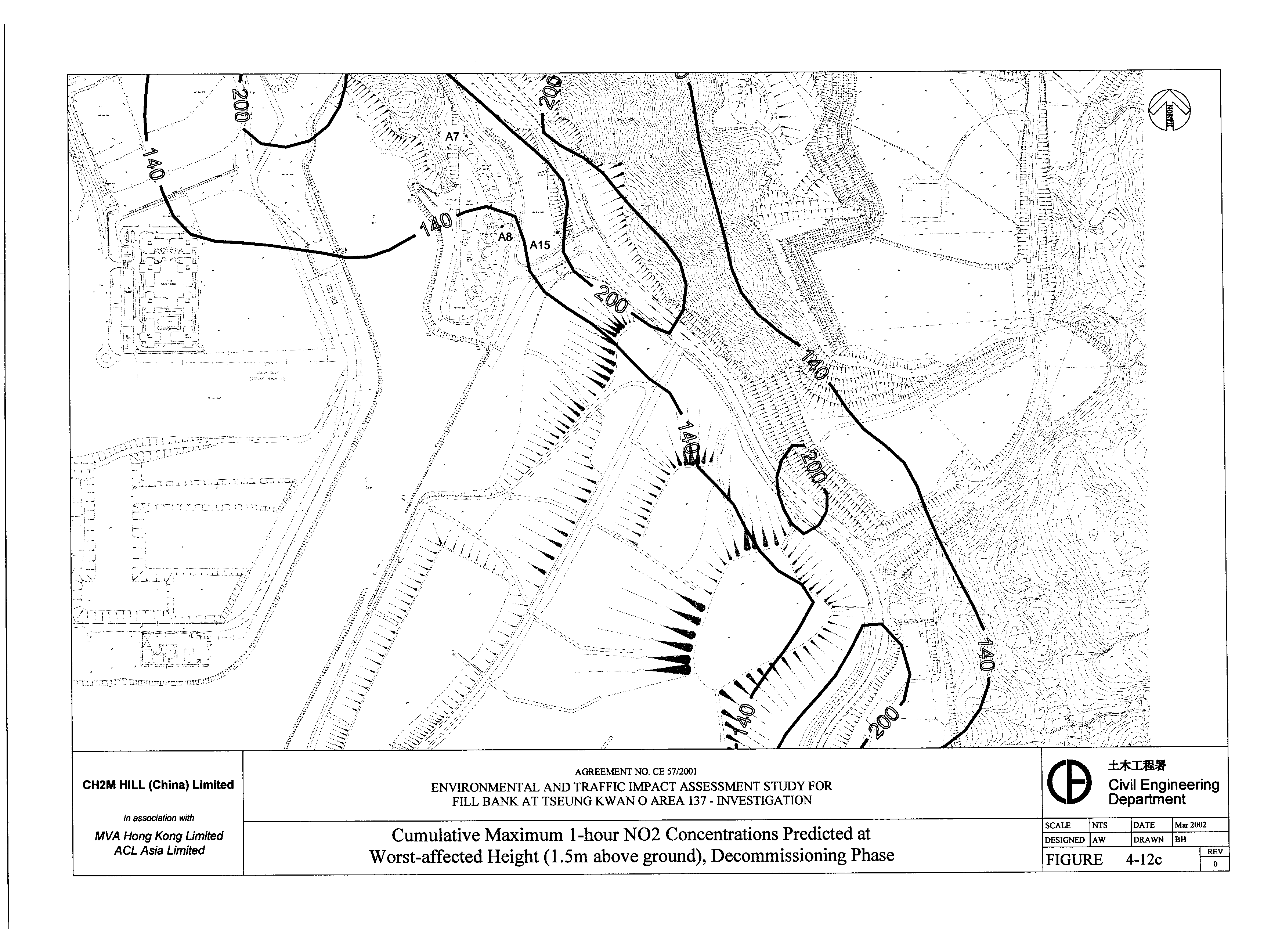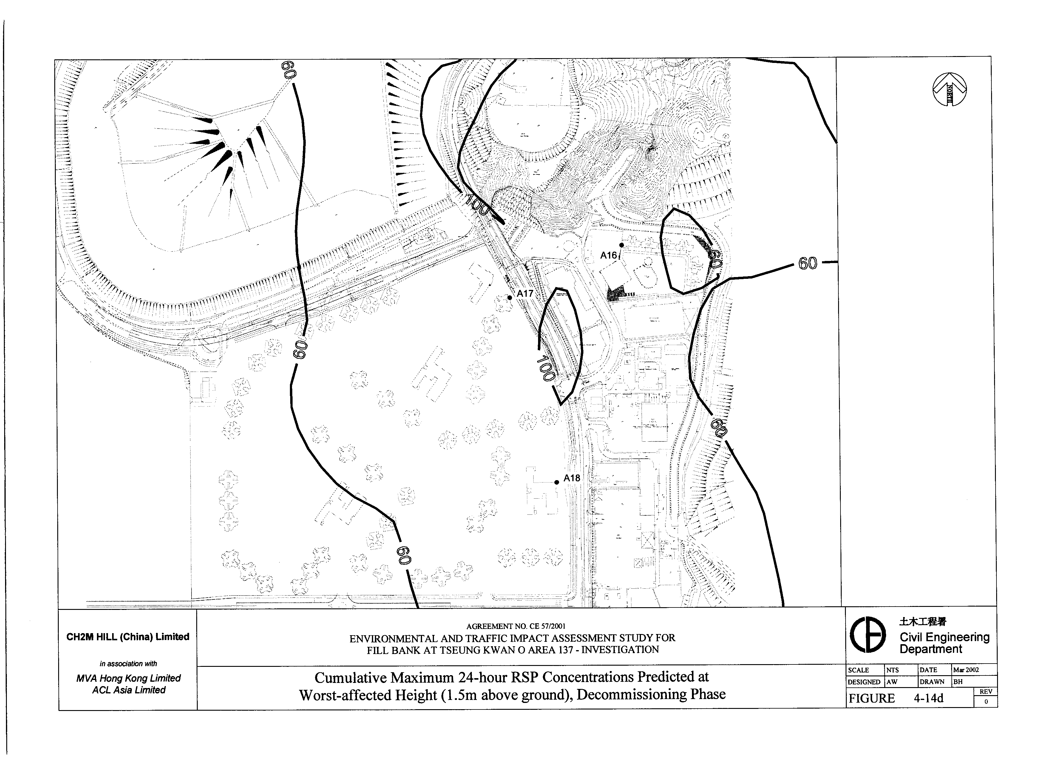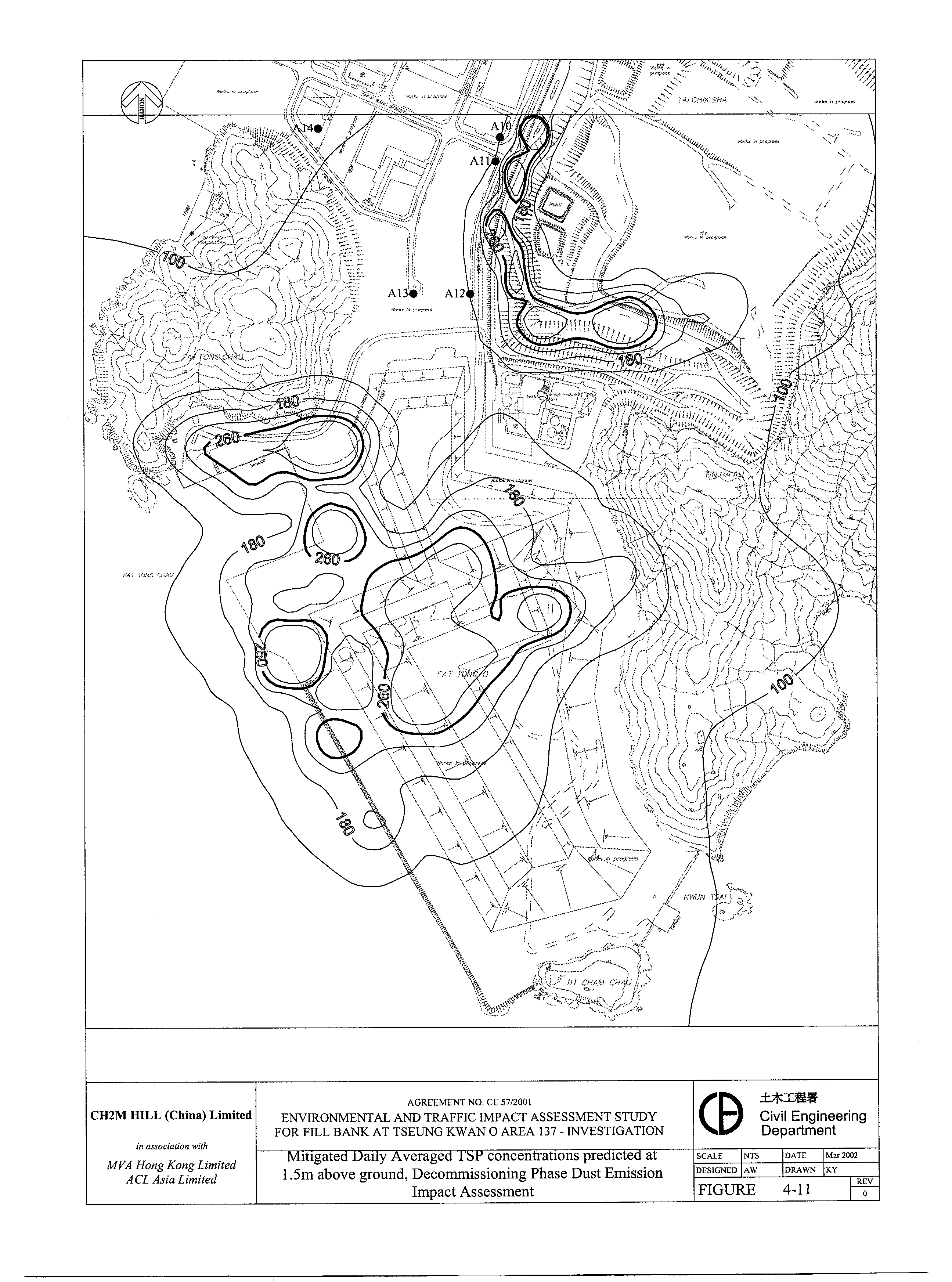 11.3.3 During the establishment of the fill bank, it is recommended that a site hoarding of 2.4m high (from ground level) shall be erected along the northern side of the site boundary except at the site entrance/ exit location. All designated haul roads, especially those lying within 100m of the site boundary shall be paved with concrete, bituminous materials, hardcores or metal plates and regularly maintained. Work areas where excavation or earthmoving activities are carried out shall be sprayed with water or a dust suppression chemical. Any temporary stockpiling of excavated material generated from the establishment works shall be covered by impervious sheeting or sprayed with water or a dust suppression chemical. With the dust control measures implemented, potential dust impact during the establishment phase is not expected to be a concern.