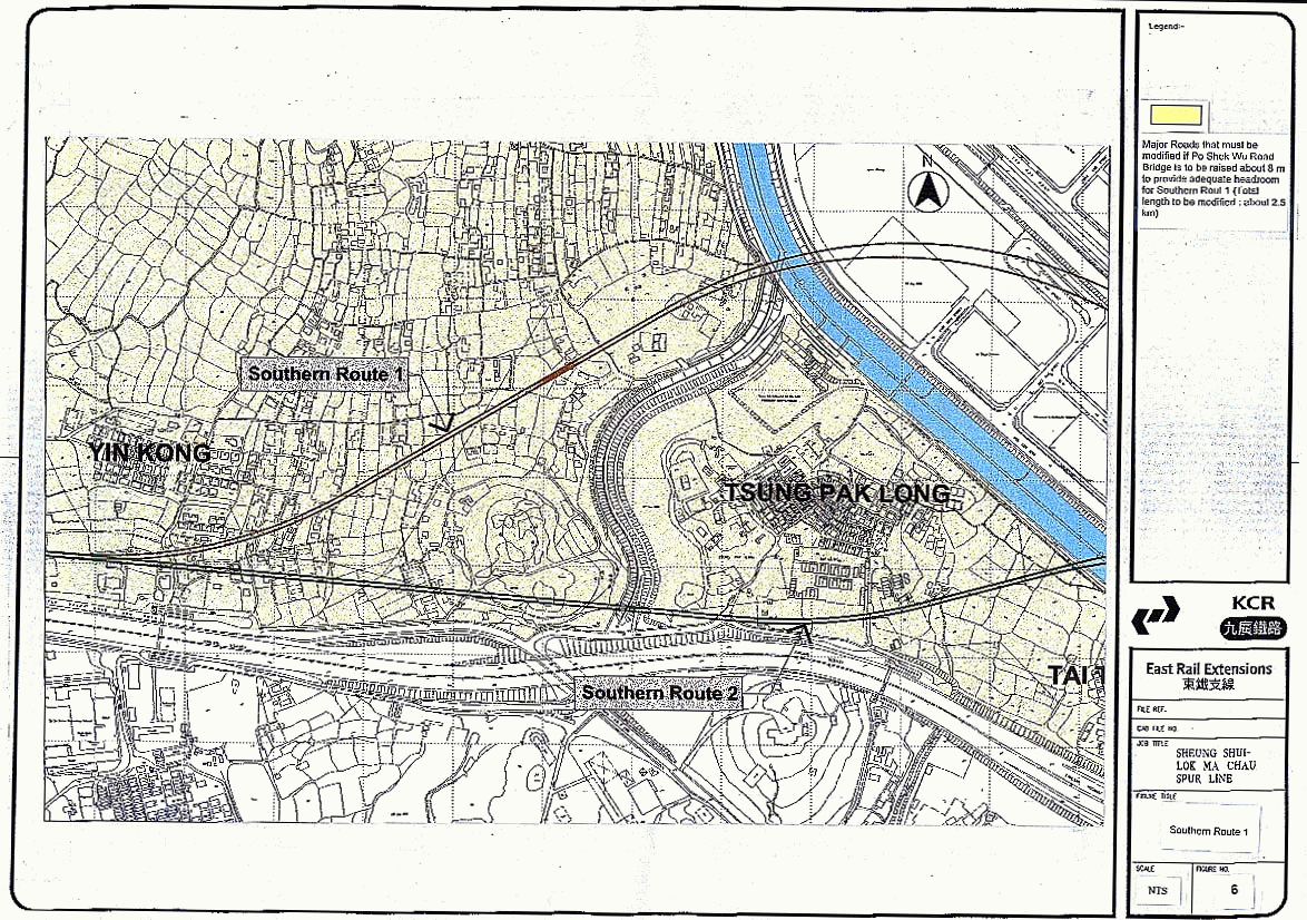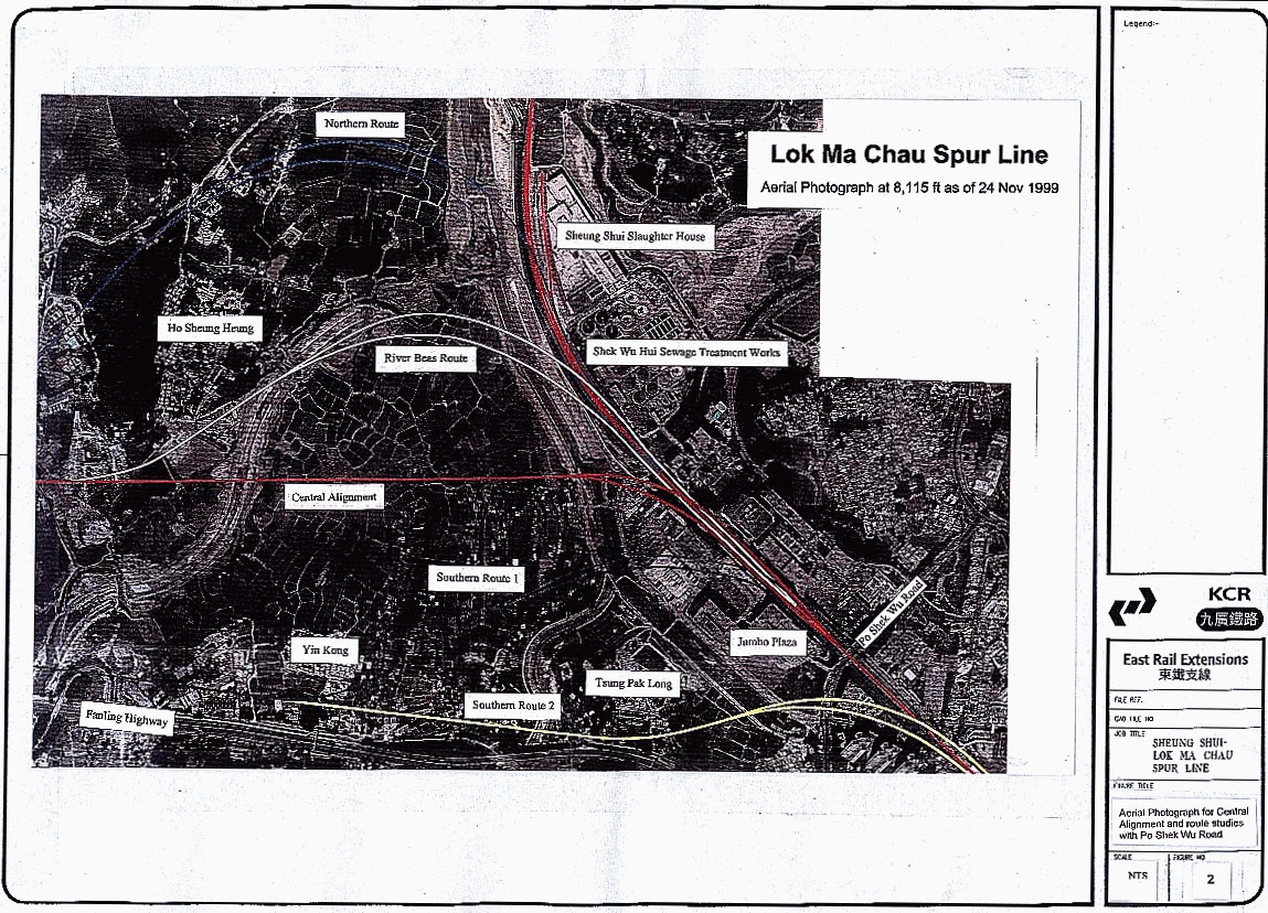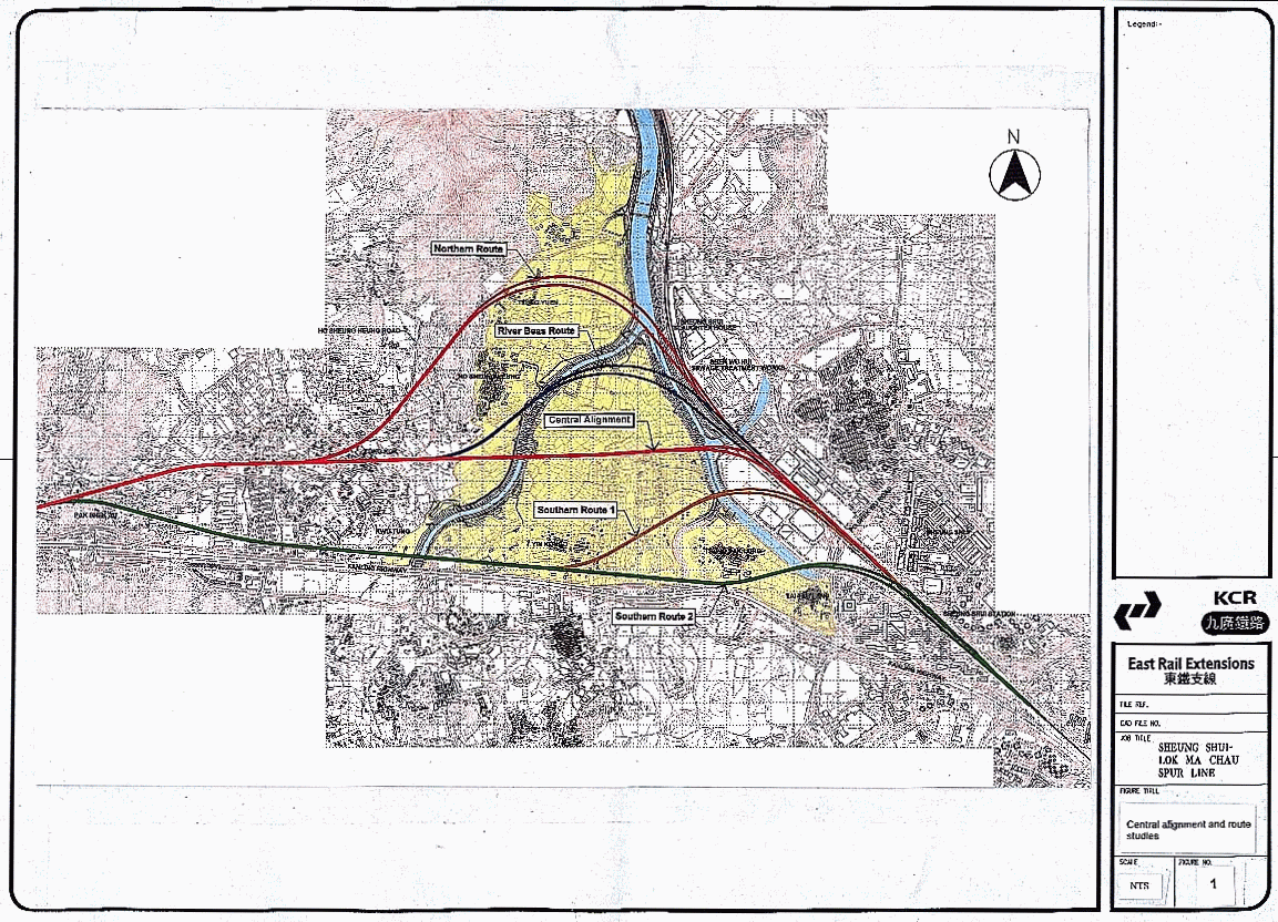 2.17 For this route the Spur Line branches off from East Rail at a point between that of the Central Alignment and the Northern Route and traverses through the northern section of Long Valley. The route utilizes a continuous reverse curve to join to the Central Alignment east of Tong Kok, passing close to the village of Ho Sheung Heung and the Hung Shing Pui Fung Temple.