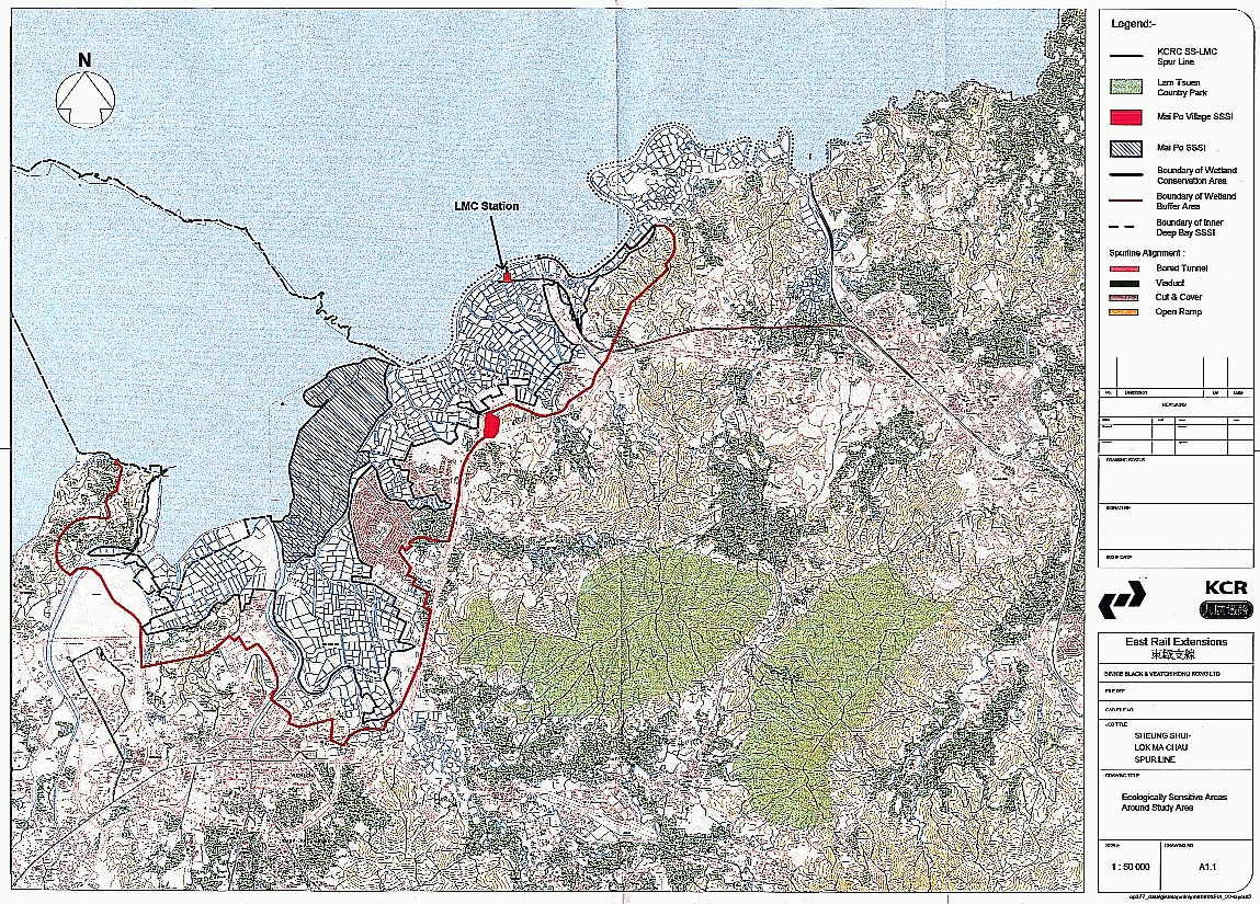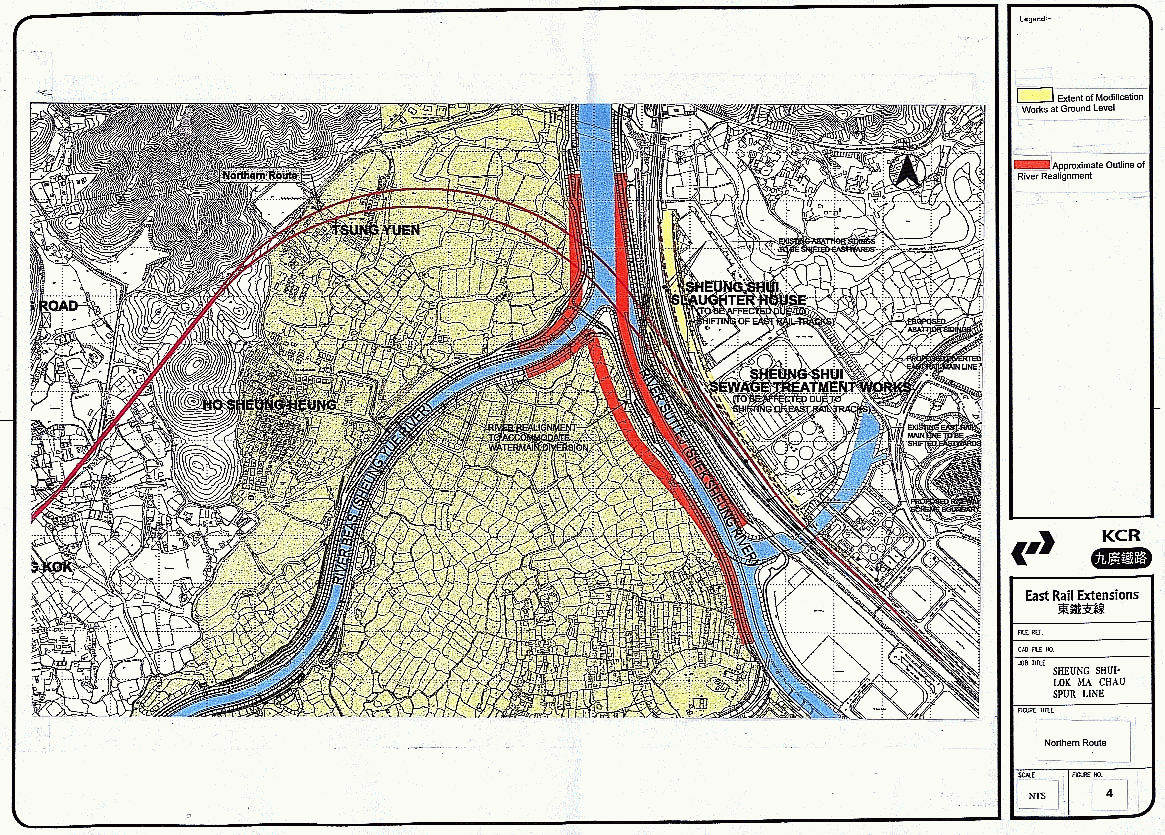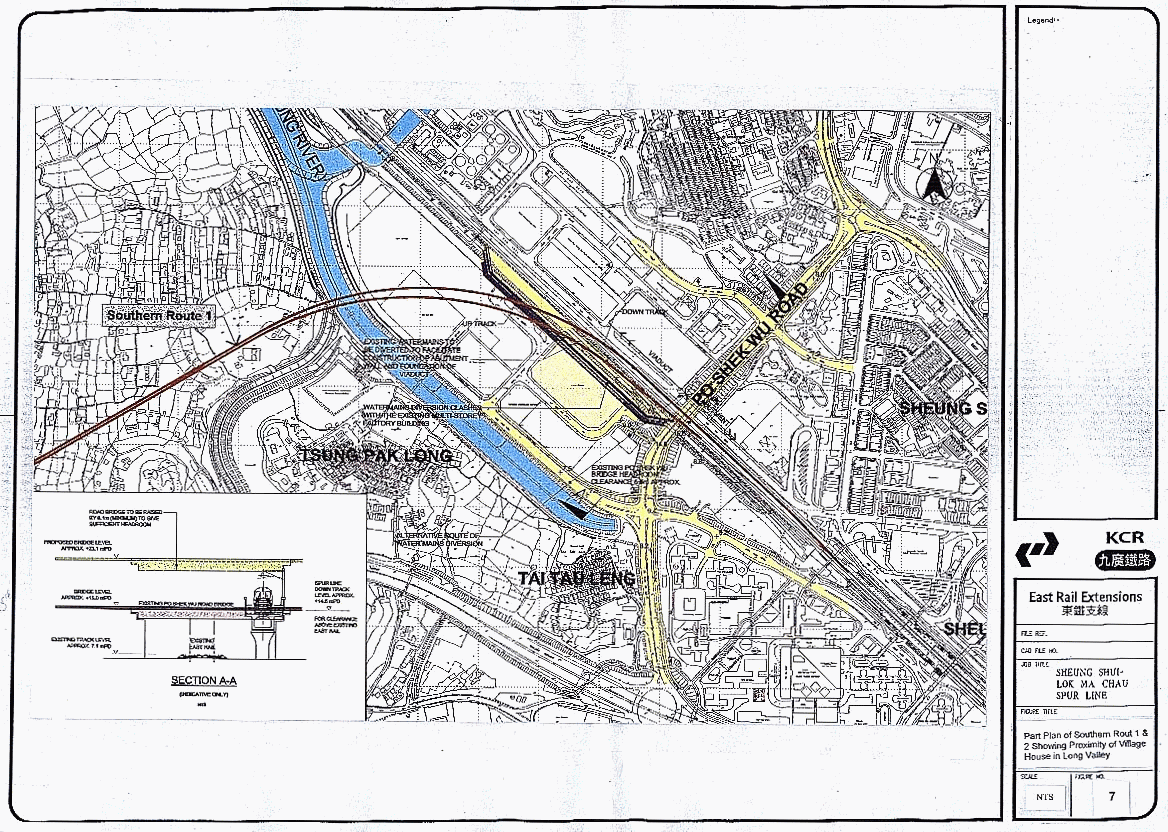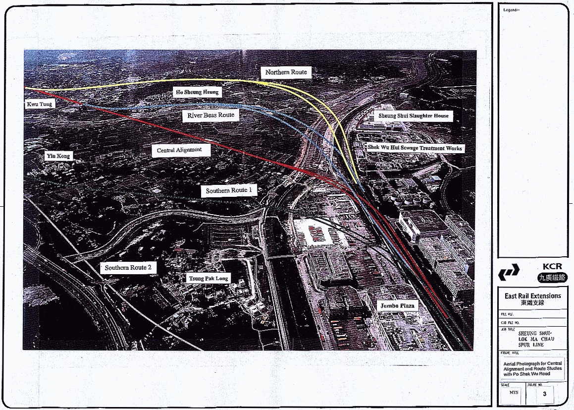 2.17 For this route the Spur Line branches off from East Rail at a point between that of the Central Alignment and the Northern Route and traverses through the northern section of Long Valley. The route utilizes a continuous reverse curve to join to the Central Alignment east of Tong Kok, passing close to the village of Ho Sheung Heung and the Hung Shing Pui Fung Temple.