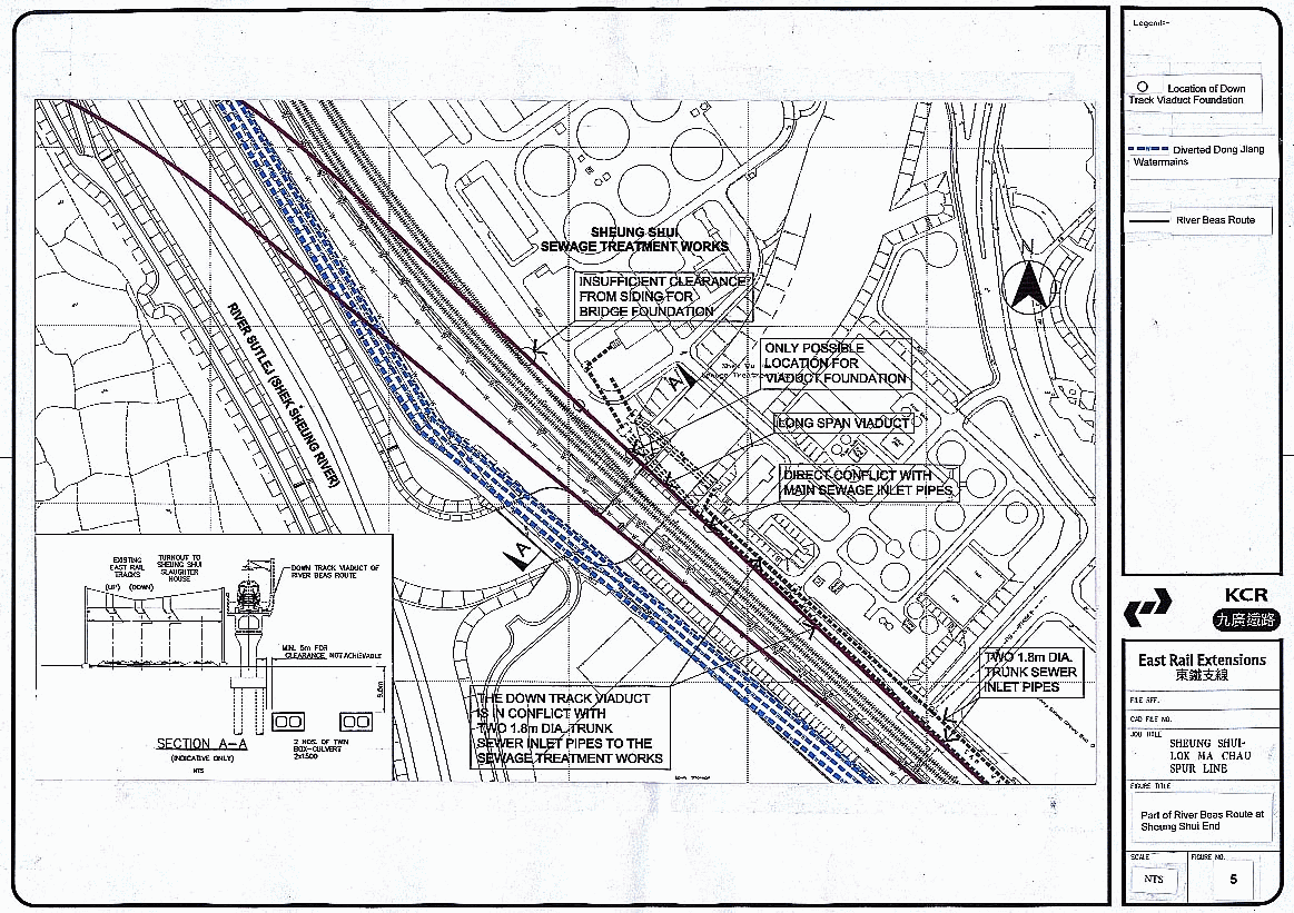 2.20 There is a critical location on this corridor where the sewer inlet pipes pass under the River Sutlej tributary in a box culvert. At this location the delivery sidings to the Sheung Shui Slaughterhouse connect to East Rail. The combination of the underground pipelines and the siding turnout from East Rail effectively sterilizes the available space between the railway and the sewage treatment works making it impossible to construct the viaduct support column foundations. There is no potential to move the sewer inlet pipes as any alternative route would impact other essential sewage treatment works facilities.