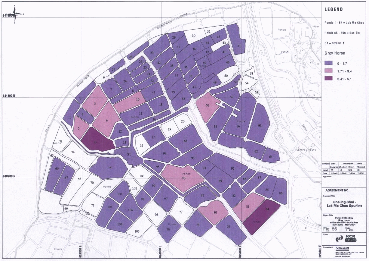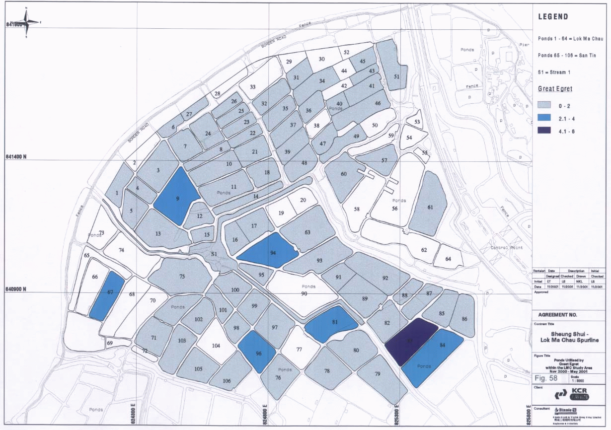 1.4.45 At Lok Ma Chau numbers fluctuated markedly (Figure 19) largely in response to drain down of fishponds. The peak count was 125 on 28 September 2000. Distribution and average number per visit are shown in Figure 58.
