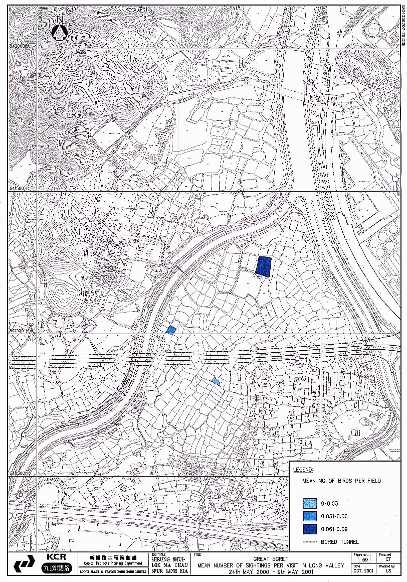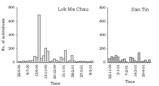 1.4.50 At San Tin numbers were generally lower, with a peak of 138 on 28 March 2001 (Figure 21). Distribution and average number per visit are shown in Figure 60.
