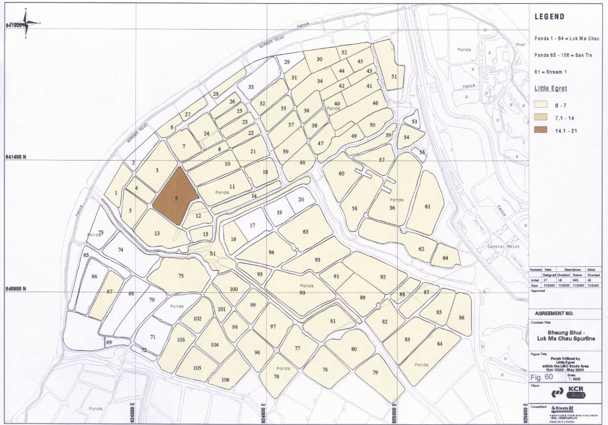 1.4.49 At Lok Ma Chau most counts were of less than 200 birds, with the exception being a count of 694 on 28 Sep 2000 (Figure 21). The count of 694 was largely made up of 680 birds on a single pond. These had been disturbed from a nearby drained pond. Distribution and average number per visit are shown in Figure 60.