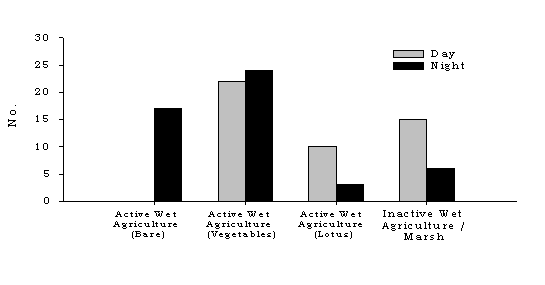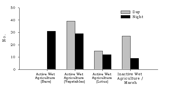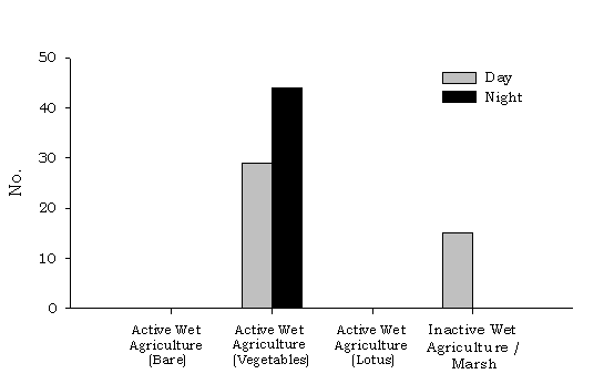 1.4.93 Differences were detected in day and night habitat preferences. Figures 73, 74, 75, 76, 77, 78 show the number of detections for day and night for each of the main habitat types for summer, autumn, and winter. During summer and autumn, bare agricultural fields (recently harvested or ploughed) were used only at night. This habitat was not available during the winter period, as no fields were in such a condition. For each season, active wet agriculture (vegetables) was the habitat from which there were the highest number of detections (Figures 33, 34, 35). This habitat was extensively utilised during the day, and at night. The other type of active wet agriculture, a field of lotus, was utilised during summer and autumn, but not during winter when It becomes completely dry. Inactive agriculture/marsh was primarily a diurnal habitat.