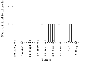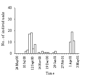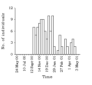1.4.128 Present on most dates autumn through to spring, with a maximum of 10 on 1 and 18 January 2000 (Figure 40). Distribution and average number per visit are shown in Figure 84.