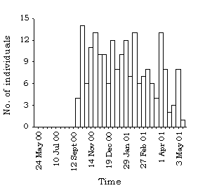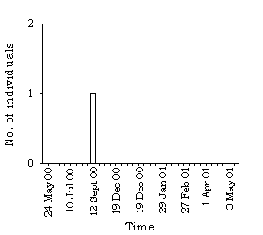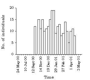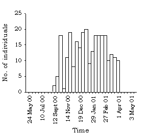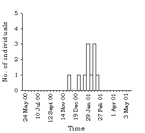 1.4.139 Present until the spring, with a peak of 10 on 22 November 2000 and 10 January 2001 (Figure 45). Distribution and average number per visit are shown in Figure 89.