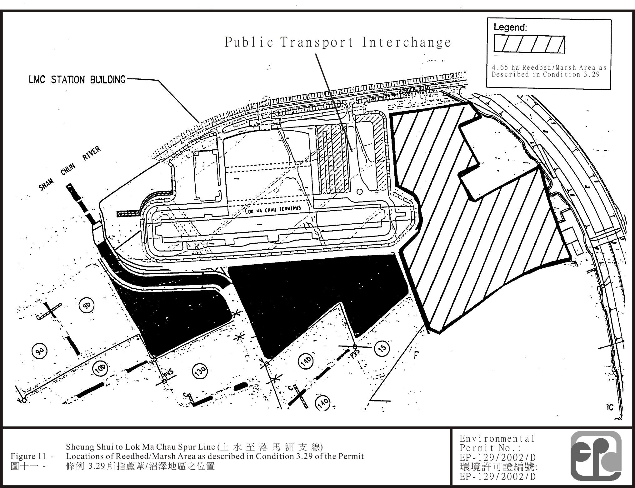 3.29 Prior to the operation of the sewage treatment plant at the Lok Ma Chau station, the Permit Holder shall establish not less than 4.65 hectares of reedbed/marsh area at location indicated in Figure 11 attached to this Permit. The reedbed/marsh area shall include at least 2 hectares of reedbed for wastewater polishing purpose. The implementation of measures for the establishment of the reedbed/marsh area shall be certified by the ET Leader and verified by the IEC as conforming to the information and recommendations contained in the EIA report.
