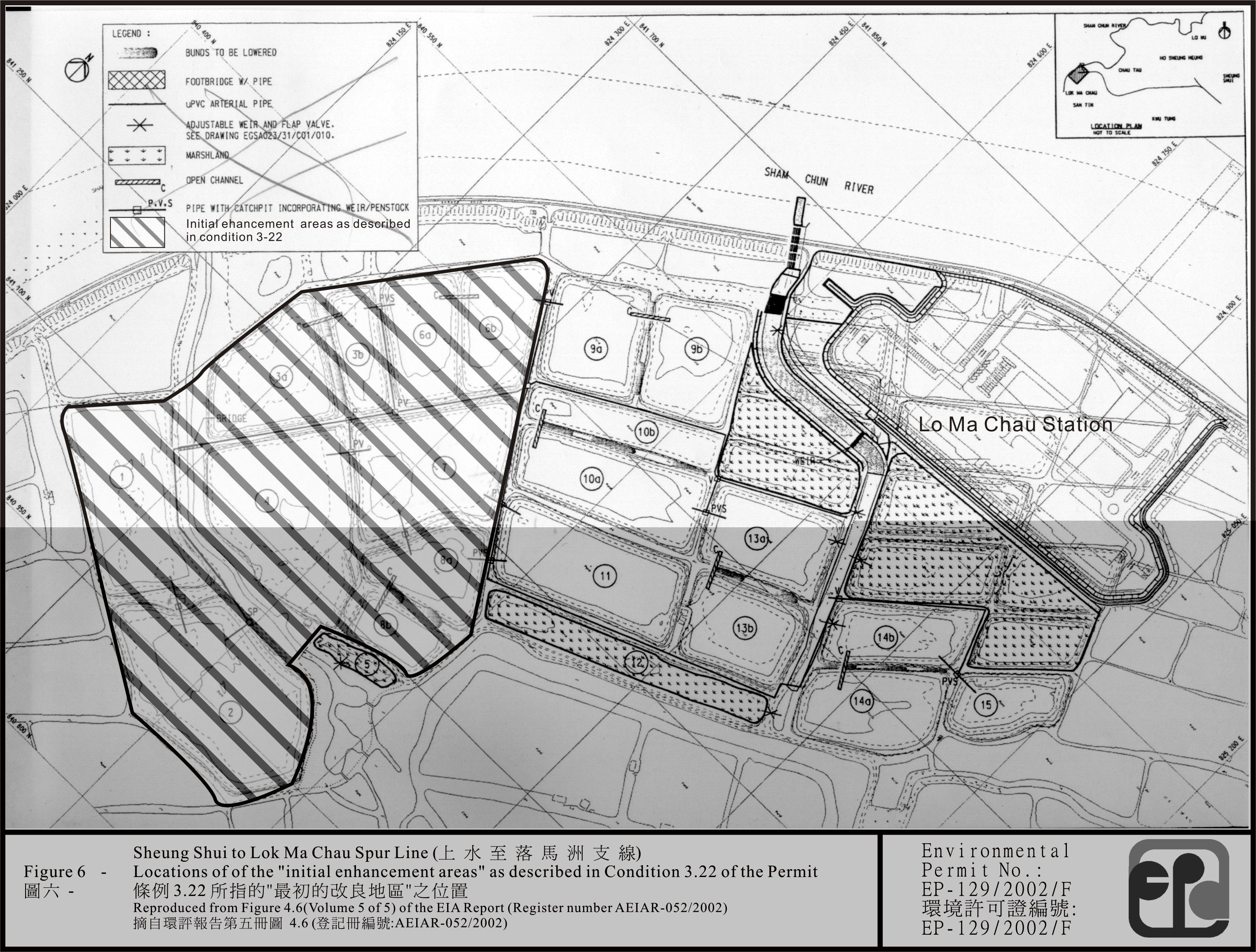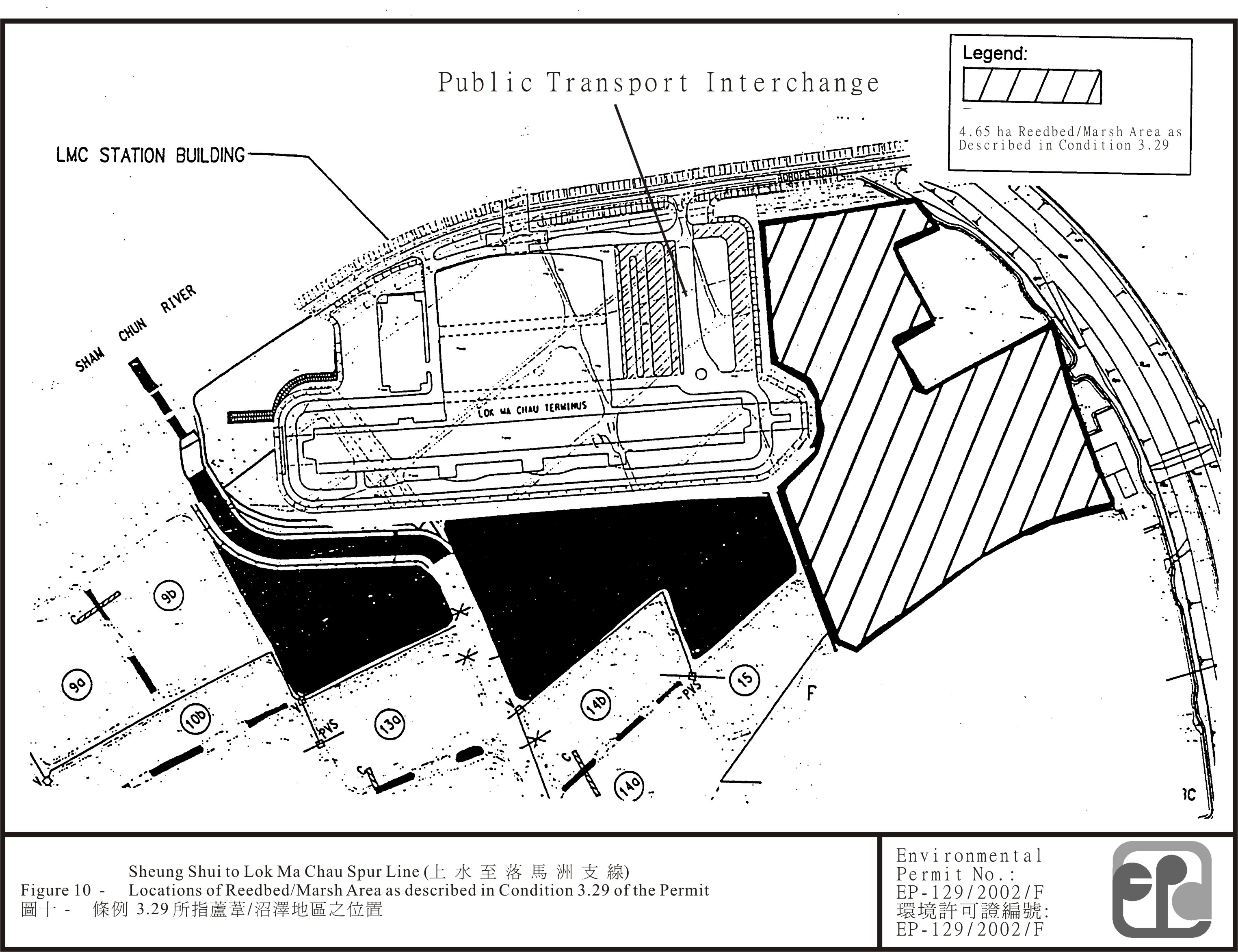 3.29 Prior to the operation of the sewage treatment plant at the Lok Ma Chau station, the Permit Holder shall establish not less than 4.65 hectares of reedbed/marsh area at location indicated in Figure 10 attached to this Permit. The reedbed/marsh area shall include at least 2 hectares of reedbed for wastewater polishing purpose. The implementation of measures for the establishment of the reedbed/marsh area shall be certified by the ET Leader and verified by the IEC as conforming to the information and recommendations contained in the EIA report.