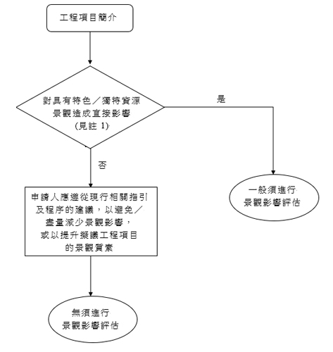 以下流程圖概述決定是否需要為某項指定工程項目進行景觀影響評估的一般程序。或須審視文獻及/或進行初步實地視察,以查看工程項目會否對具有獨特景觀的特殊價值造成任何直接影響。