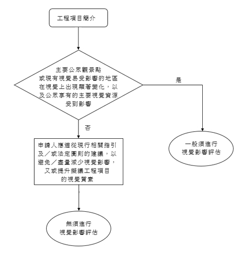 以下流程圖概述決定是否需要為某項指定工程項目進行視覺影響評估的一般程序,從而識別及預測指定工程項目的永久影響。