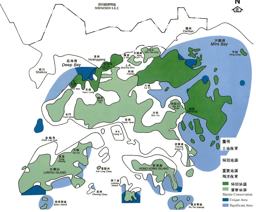 全港發展策略檢討的環境基線研究確定了多項環境限制,當中包括本港的環境敏感地區及其保育價值,使這些地區免受發展專案破壞 (圖九)。