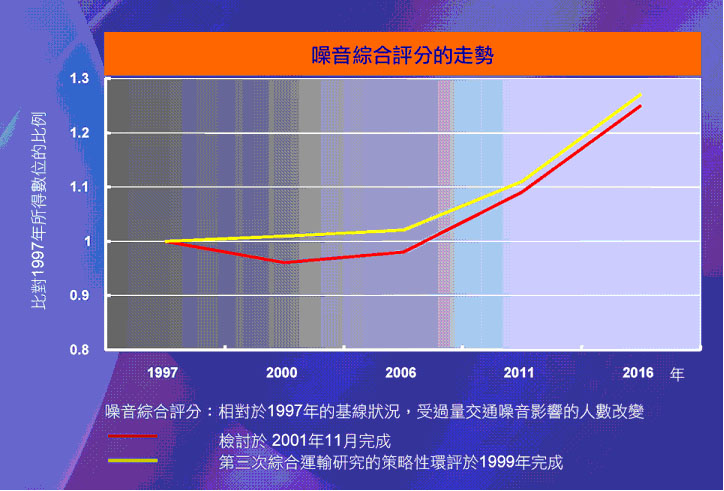 與此同時,有關當局每年亦會考慮政策的假定,如人口、土地運用、社會、經濟、各項管制措施所造成影響等的最新預測資料,然後更新噪音 / 空氣綜合評分的預測。有關結果將與策略性環評的一九九七年原有預測作比較,以確定在這段時間有否出現任何可能令環境質素下降的趨勢。