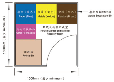 The Government has been addressing all of these concerns through a series of measures to support the Programme. In 2008 we made regulatory changes to building codes to require new buildings to include storage areas for recovered waste. The amendment to the Building (Refuse Storage and Material Recovery Chambers and Refuse Chutes) Regulations under the Buildings Ordinance states that all new domestic buildings and the domestic part of new composite buildings must provide a refuse storage and material recovery room at least 1.5 metre x 1.5 metre in size on every floor to facilitate residents’ participation in waste recovery. The amendment came into effect 1 December 2008. |