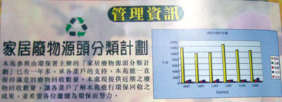 “Ka Lung Court joined the Programme on Source Separation of Domestic Waste in 2006 and we’ve seen a big increase in the amount of recyclables that we collect. Waste paper has tripled, from 4,300 kg in October 2006 to 13,100 kg in March 2008. We are also collecting a lot more metals and plastics. This has helped us achieve our target of reducing domestic waste that needs disposal. Our high collection rate earned us a Bronze Award in the Competition on Source Separation of Domestic Waste 2007/08.”