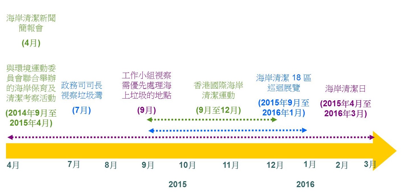 在2014年11月至2015年4月期間,來自50所學校的464位同學,參加了在鯉魚門、烏溪沙、赤柱正灘及石澳後灘的29場海岸清潔活動。透過這些清潔活動,除得到的寶貴經驗外,參加者亦接觸了海岸生態的課題,相信這活動對學生環境保護大使,以至修讀高中通識課程的學生尤具禆益。