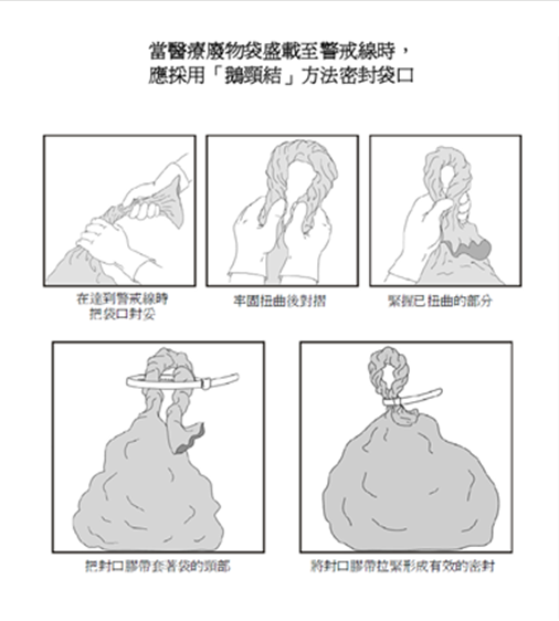 利器收集箱應以專用密封方法妥為密封,而塑膠桶則應適當使用專用密封方法或膠紙密封。密封膠袋時,應穩妥地緊束袋的頸部,以防止醫療廢物濺溢。建議採用如圖 1 所示的「鵝頸結」封口方法。
