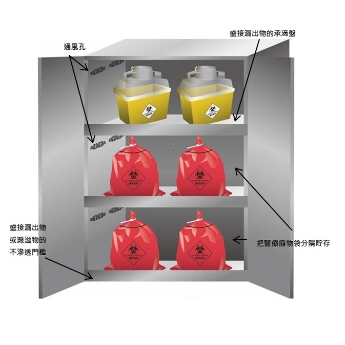 廢物產生者應提供適當和足夠的地方,在場內作暫時貯存醫療廢物之用。貯存地方應接近醫療廢物產生的源頭,以盡量減省處理廢物的工作和方便管理。