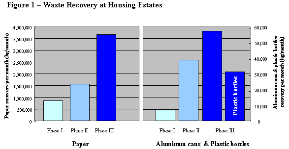 Since late 1997, the two Municipal Councils have provided collection bins for paper, plastics and aluminum at 20 locations in public areas such as bus terminals, streets and outside markets. Another 118 locations in the then Provisional Regional Council area were provided with recycling bins in October 1999. The then Regional Services Department (RSD) has included recyclable collection services in the waste collection contracts in Tai Po and Shatin Districts since May and November 1998 respectively. The Food and Environmental Hygiene Department plan to contract out similar services in Tsuen Wan and Kwai Tsing Districts in May 2000 and March 2001 respectively. |
