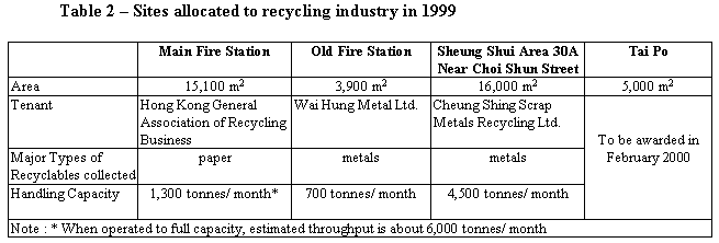 We aim to provide a more viable operating environment for the recycling industry by making available to waste recyclers suitable land, on a short term basis, and at low cost. Since 1998, three sites (one in Sheung Shui and two in the former Kai Tak Airport) have been allocated for waste metal and waste paper operators. The quantity of materials currently recycled in these sites amounts up to about 5,200 tonnes of metals and 1,300 tonnes of paper per month. In December 1999, another site in Tai Po was open to public tender for the waste recycling trade and would be leased out in early 2000. Several other sites have been identified and are being processed. However, successful acquisition of the sites for the recycling trade is a lengthy and difficult process with the majority of sites being rejected either by the District Boards or other relevant bodies. More support from the Lands Department in offering short term tenancy sites will be crucial to assist the local recycling industry. Besides, we will consider other means to secure more long term and relatively cheap land for the recycling industry. |