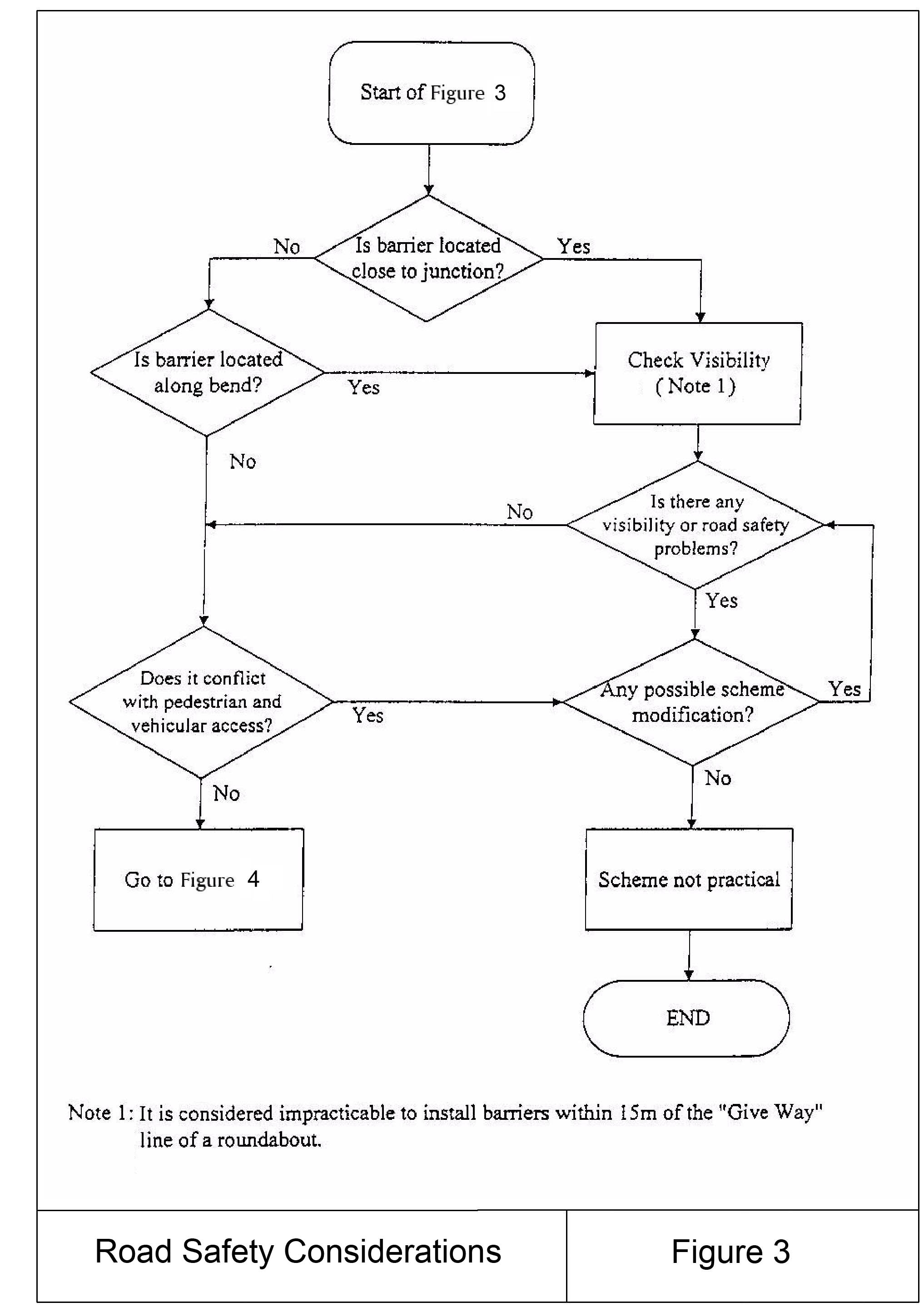 2.12 This Guiding Principle aims to ensure that the new structures will not undermine road safety or impede pedestrian and vehicular movements. The noise barrier should not be erected at locations where they may pose any hazard to road safety or reduce the degree of road safety. This is particularly essential for barriers close to an existing intersection as it could affect the visibility of both pedestrian and drivers. Also, provision of a barrier along a bend in the road may obstruct the sight line for stopping safely. The logic is that the principle of “Seeing and be seen” must not be violated. The sight distance should not be less than the desirable minimum as stipulated in TPDM. Figure 3 illustrates the process of road safety considerations.