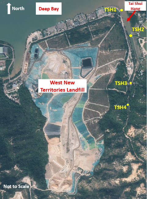 Environmental Protection Department (hereafter referred to as "EPD") has been continuously conducting water quality monitoring at Tai Shui Hang near the West New Territories (WENT) Landfill. Regular water sampling and testing are conducted at four designated water quality monitoring points (namely TSH1, TSH2, TSH3 and TSH4) as shown in the figure below. The EPD collects water samples twice per month during, before and after the wet season (i.e. March to October of each year) and once per month during the dry season (i.e. November to February of the following year). The water quality in Tai Shui Hang is monitored and assessed with reference to the Water Quality Index (WQI) used by the EPD.