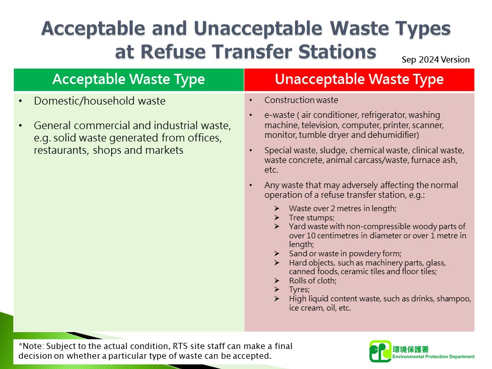 Refuse transfer station users shall comply with the provisions of the Waste Disposal (Refuse Transfer Station) Regulation (Cap.354 sub leg) and the Service Conditions.