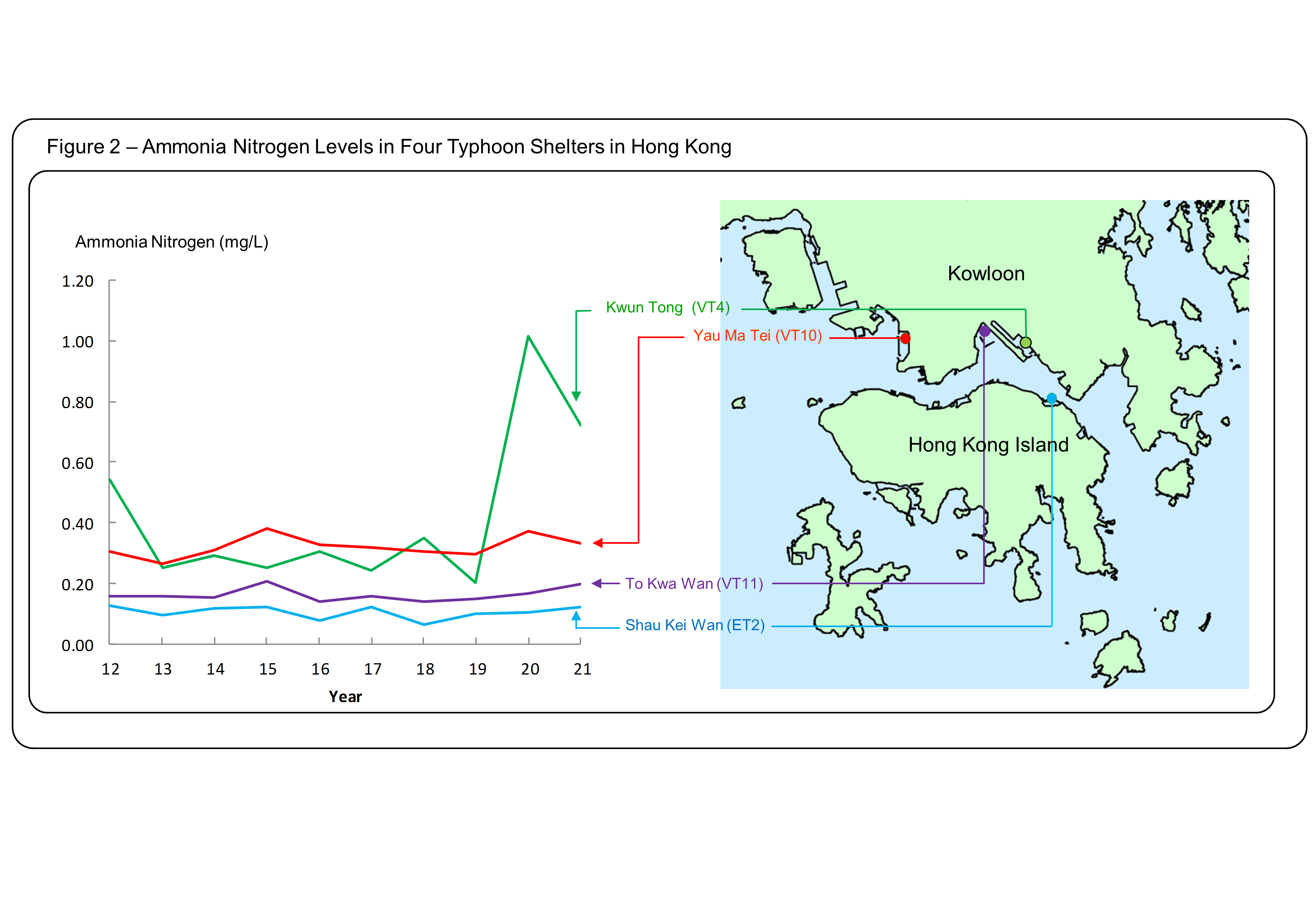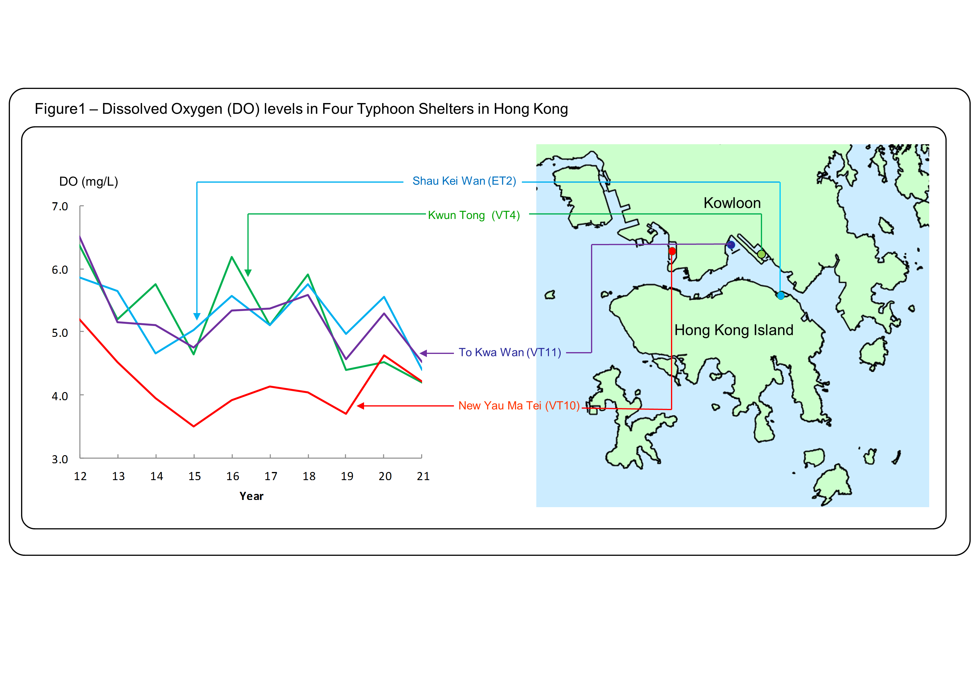 Pollution in typhoon shelters is reflected in the water quality parameters regularly measured by the Environmental Protection Department (EPD). Figure 1 shows the Dissolved Oxygen (DO) levels in four typhoon shelters in Hong Kong. The Ammonia Nitrogen levels in the typhoon shelters are shown in Figure 2. Further information on the water quality of typhoon shelters is available in the annual report Marine Water Quality in Hong Kong.