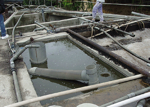 Top view: the wastewater treatment tanks and the drainage pipes (collection tank, settling tanks, aeration tank, discharge pipe connected to the final settling tanks)
