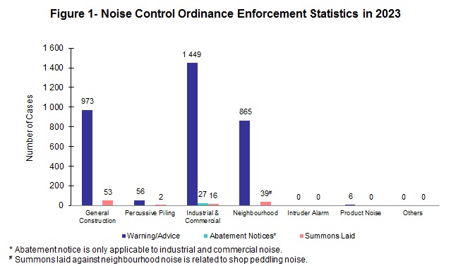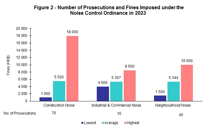 Enforcement of the Noise Control Ordinance (NCO) is carried out by both the Police and the Environmental Protection Department (EPD). The Police responds to public complaints about neighbourhood noise from public places & domestic premises, construction noise, product noise and noise from intruder alarms, whereas the EPD investigates complaints on noise from industrial or commercial premises, construction sites and shop peddling activities. The enforcement and prosecution statistics are summarised in Figure 1 to 3. Offenders are liable to a maximum fine at level 3 (i.e. $10,000) on convictions of offences relating to neighbourhood noise while the maximum fine is at level 6 (i.e. $100,000) on first conviction and $200,000 on further convictions for offences relating to construction, industrial and commercial noise. In 2023, there were 70, 16 and 45 prosecutions for construction noise, industrial and commercial noise; and neighbourhood noise on shop peddling activities respectively. |